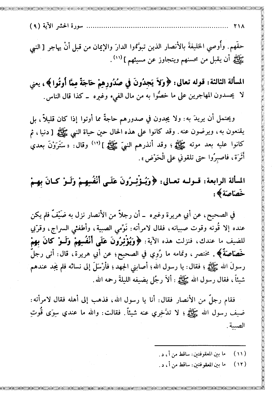 الْمَسْأَلَةُ الرَّابِعَةُ قَوْله تَعَالَى: {وَيُؤْثِرُونَ عَلَى أَنْفُسِهِمْ وَلَوْ كَانَ بِهِمْ خَصَاصَةٌ} [الحشر: 9]: فِي الصَّحِيحِ عَنْ أَبِي هُرَيْرَةَ وَغَيْرِهِ أَنَّ رَجُلًا مِنْ الْأَنْصَارِ نَزَلَ بِهِ ضَيْفٌ فَلَمْ يَكُنْ عِنْدَهُ إلَّا قُوتُهُ وَقُوتُ صِبْيَانِهِ، فَقَالَ لِامْرَأَتِهِ: نَوِّمِي الصِّبْيَةَ، وَأَطْفِئِي السِّرَاجَ، وَقَرِّبِي لِلضَّيْفِ مَا عِنْدَك، فَنَزَلَتْ هَذِهِ الْآيَةُ: {وَيُؤْثِرُونَ عَلَى أَنْفُسِهِمْ وَلَوْ كَانَ بِهِمْ خَصَاصَةٌ} [الحشر: 9].