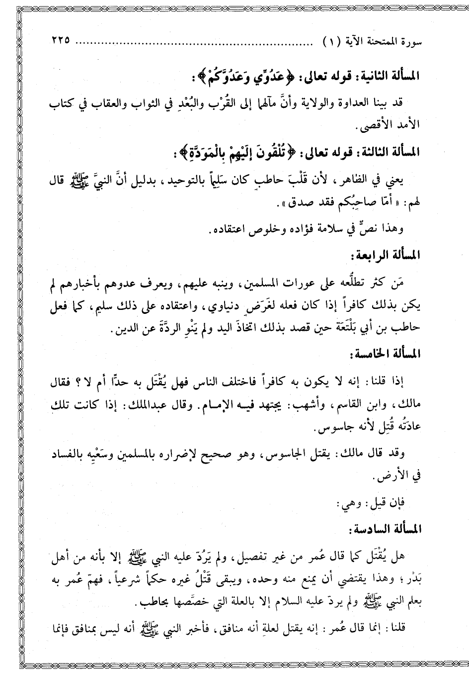 الْمَسْأَلَةُ الرَّابِعَةُ مَنْ كَثُرَ تَطَلُّعُهُ عَلَى عَوْرَاتِ الْمُسْلِمِينَ، وَيُنَبِّهُ عَلَيْهِمْ، وَيُعَرِّفُ عَدُوَّهُمْ بِأَخْبَارِهِمْ لَمْ يَكُنْ بِذَلِكَ كَافِرًا إذَا كَانَ فِعْلُهُ لِغَرَضٍ دُنْيَوِيٍّ، وَاعْتِقَادُهُ عَلَى ذَلِكَ سَلِيمٌ، كَمَا فَعَلَ حَاطِبُ بْنُ أَبِي بَلْتَعَةَ حِينَ قَصَدَ بِذَلِكَ اتِّخَاذَ الْيَدِ وَلَمْ يَنْوِ الرِّدَّةَ عَنْ الدِّينِ.