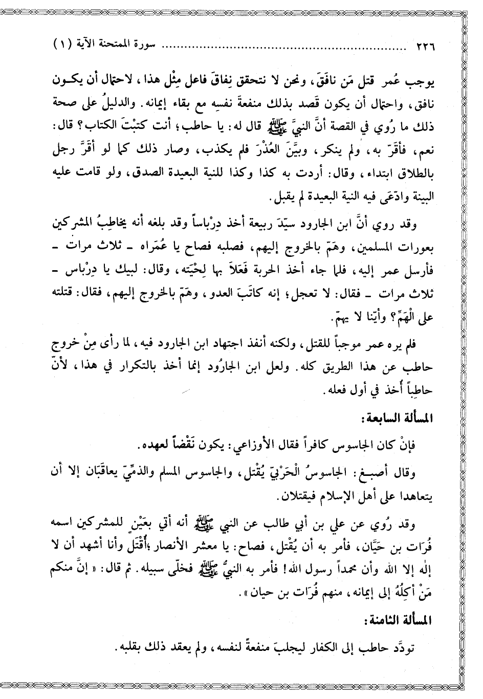 الْمَسْأَلَةُ الثَّامِنَةُ تَوَدَّدَ حَاطِبٌ إلَى الْكُفَّارِ لِيَجْلُبَ مَنْفَعَةً لِنَفْسِهِ، وَلَمْ يَعْقِدْ ذَلِكَ بِقَلْبِهِ.
