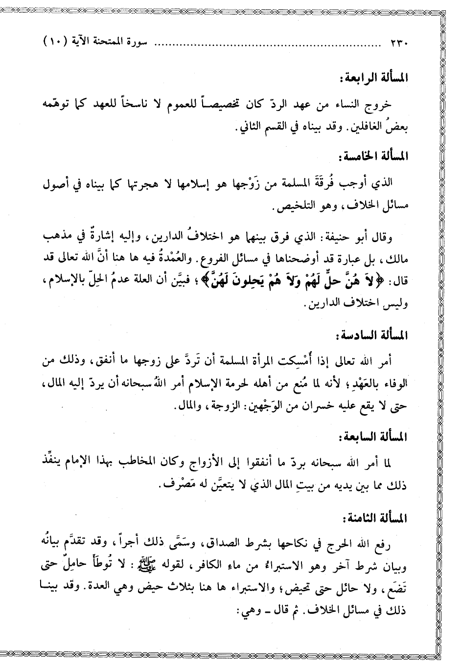 الْمَسْأَلَةُ الرَّابِعَةُ خُرُوجُ النِّسَاءِ مِنْ عَهْدِ الرَّدِّ كَانَ تَخْصِيصًا لِلْعُمُومِ لَا نَاسِخًا لِلْعَهْدِ كَمَا تَوَهَّمَهُ بَعْضُ الْغَافِلِينَ. وَقَدْ بَيَّنَّاهُ فِي الْقِسْمِ الثَّانِي.