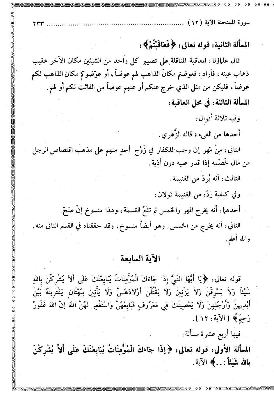 فِيهَا أَرْبَعَ عَشْرَةَ مَسْأَلَةً: الْمَسْأَلَةُ الْأُولَى قَوْله تَعَالَى: {إِذَا جَاءَكَ الْمُؤْمِنَاتُ يُبَايِعْنَكَ عَلَى أَنْ لا يُشْرِكْنَ بِاللَّهِ شَيْئًا} [الممتحنة: 12] الْآيَةَ.