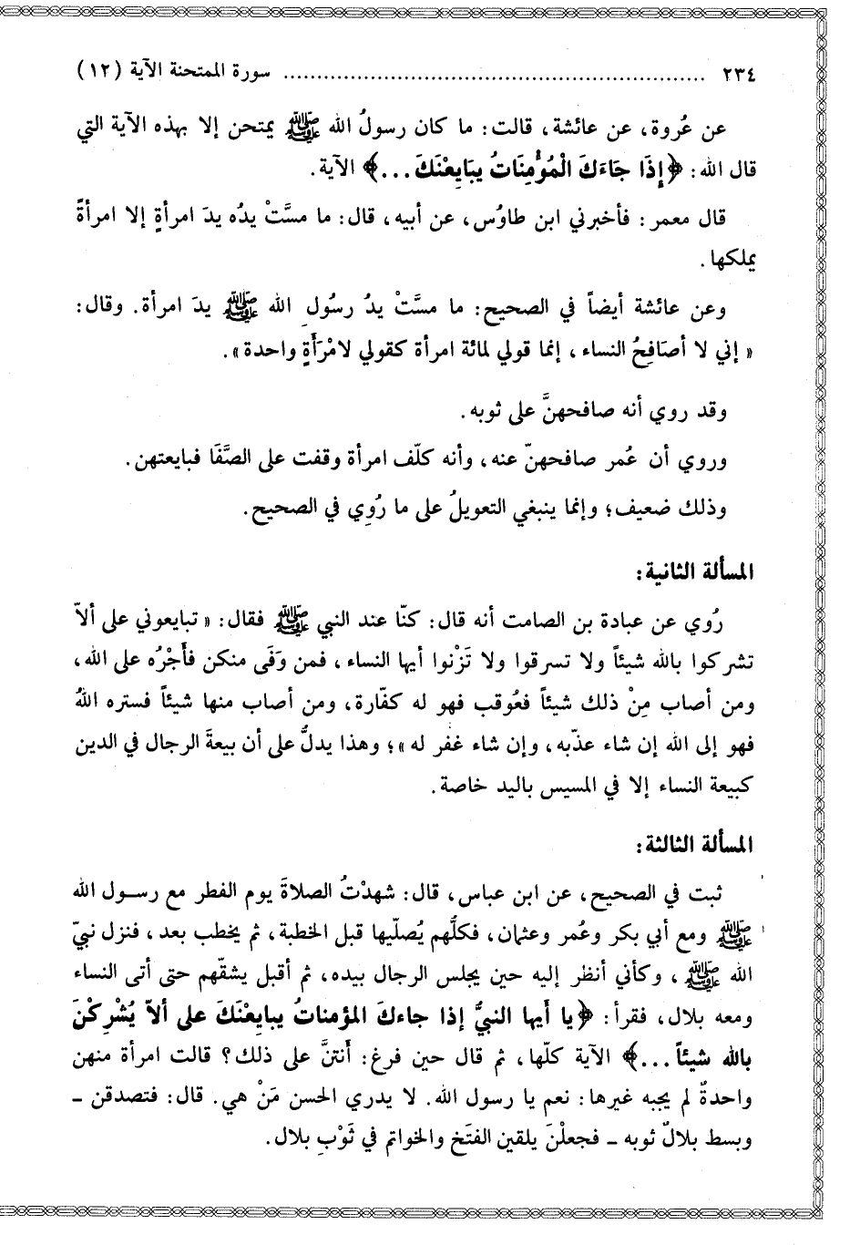 عَنْ عُرْوَةَ عَنْ عَائِشَةَ قَالَتْ: «مَا كَانَ رَسُولُ اللَّهِ - صَلَّى اللَّهُ عَلَيْهِ وَسَلَّمَ - يَمْتَحِنُ إلَّا بِهَذِهِ الْآيَةِ الَّتِي قَالَ اللَّهُ: {إِذَا جَاءَكَ الْمُؤْمِنَاتُ يُبَايِعْنَكَ} [الممتحنة: 12] الْآيَةَ».