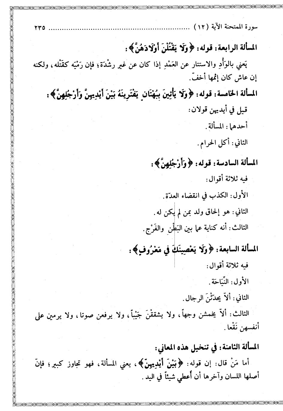 أَلَّا يَخْمُشْنَ وَجْهًا، وَلَا يَشْقُقْنَ جَيْبًا، وَلَا يَرْفَعْنَ صَوْتًا، وَلَا يَرْمِينَ عَلَى أَنْفُسِهِنَّ نَقْعًا الْمَسْأَلَةُ الثَّامِنَةُ فِي تَنْخِيلِ هَذِهِ الْمَعَانِي: أَمَّا مَنْ قَالَ: إنَّ قَوْلَهُ {بَيْنَ أَيْدِيهِنَّ} [الممتحنة: 12] يَعْنِي الْمَسْأَلَةَ فَهُوَ تَجَاوُزٌ كَبِيرٌ؛ فَإِنَّ أَصْلَهَا اللِّسَانُ وَآخِرَهَا أَنْ أُعْطِيَ شَيْئًا فِي الْيَدِ.