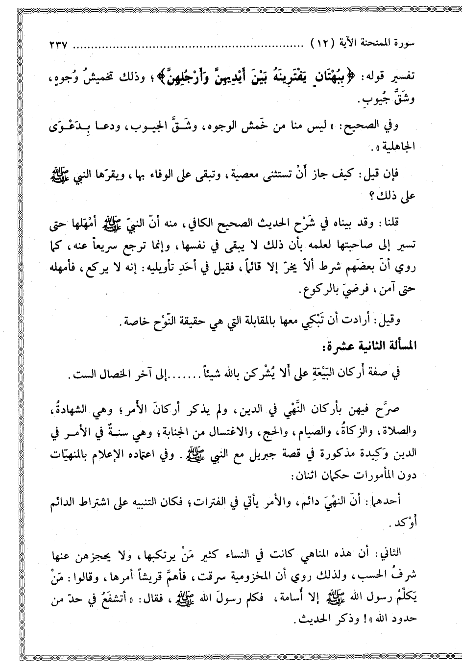 الْمَسْأَلَةُ الثَّانِيَةَ عَشْرَةَ فِي صِفَةِ أَرْكَانِ الْبَيْعَةِ عَلَى أَلَّا يُشْرِكْنَ بِاَللَّهِ شَيْئًا إلَى آخِرِ الْخِصَالِ السِّتِّ.