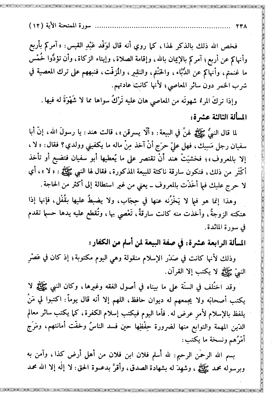 الْمَسْأَلَةُ الرَّابِعَةَ عَشْرَةَ فِي صِفَةِ الْبَيْعَةِ لِمَنْ أَسْلَمَ مِنْ الْكُفَّارِ؛ وَذَلِكَ لِأَنَّهَا كَانَتْ فِي صَدْرِ الْإِسْلَامِ مَنْقُولَةً وَهِيَ الْيَوْمَ مَكْتُوبَةٌ؛ إذْ كَانَ فِي عَصْرِ النَّبِيِّ - صَلَّى اللَّهُ عَلَيْهِ وَسَلَّمَ - لَا يُكْتَبُ إلَّا الْقُرْآنُ.