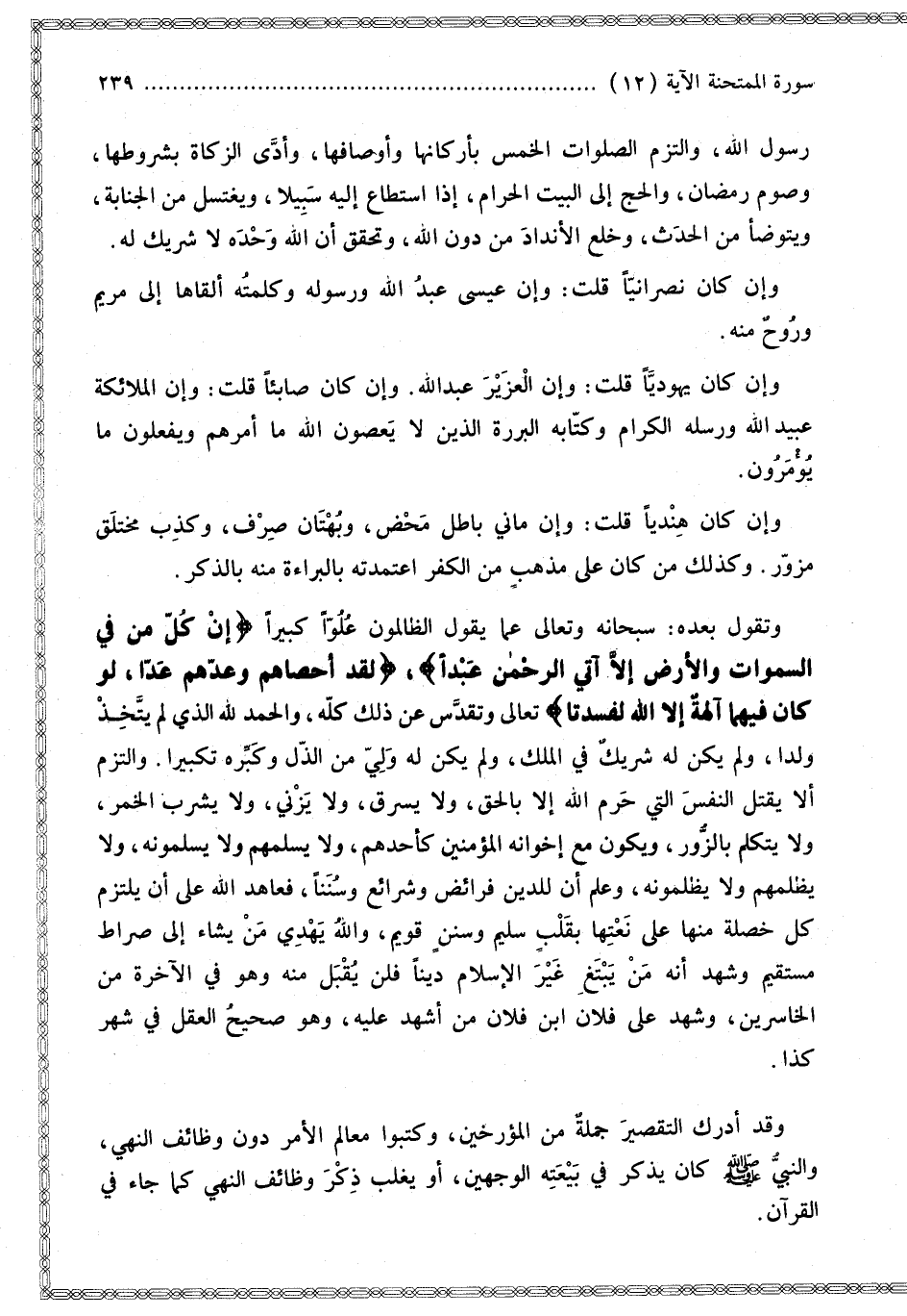 تَعَالَى وَتَقَدَّسَ عَنْ ذَلِكَ كُلِّهِ، وَالْحَمْدُ لِلَّهِ الَّذِي لَمْ يَتَّخِذْ وَلَدًا، وَلَمْ يَكُنْ لَهُ شَرِيكٌ فِي الْمُلْكِ، وَلَمْ يَكُنْ لَهُ وَلِيٌّ مِنْ الذُّلِّ وَكَبَّرَهُ تَكْبِيرًا. وَالْتَزَمَ أَلَّا يَقْتُلَ النَّفْسَ الَّتِي حَرَّمَ اللَّهُ إلَّا بِالْحَقِّ، وَلَا يَسْرِقُ، وَلَا يَزْنِي، وَلَا يَشْرَبُ الْخَمْرَ، وَلَا يَتَكَلَّمُ بِالزُّورِ، وَيَكُونُ مَعَ إخْوَانِهِ الْمُؤْمِنِينَ كَأَحَدِهِمْ، وَلَا يُسْلِمُهُمْ وَلَا يُسْلِمُونَهُ، وَلَا يَظْلِمُهُمْ وَلَا يَظْلِمُونَهُ، وَعَلِمَ أَنَّ لِلدِّينِ فَرَائِضَ وَشَرَائِعَ وَسُنَنًا، فَعَاهَدَ اللَّهَ عَلَى أَنْ يَلْتَزِمَ كُلَّ خَصْلَةٍ مِنْهَا عَلَى نَعْتِهَا بِقَلْبٍ سَلِيمٍ وَسَنَنٍ قَوِيمٍ