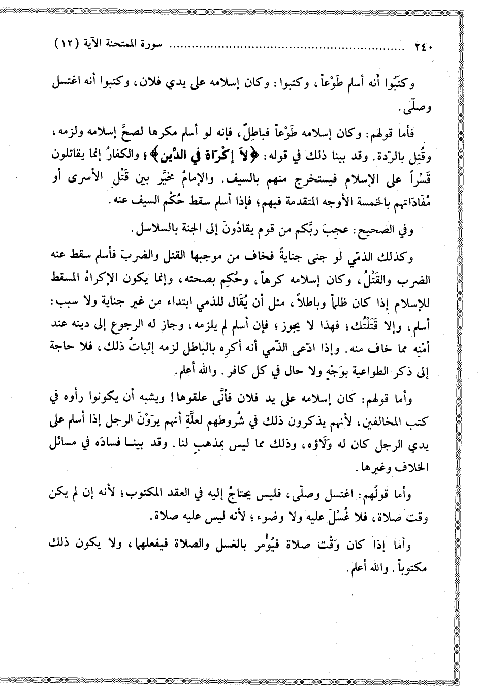 فَأَمَّا قَوْلُهُمْ: وَكَانَ إسْلَامُهُ طَوْعًا فَبَاطِلٌ، فَإِنَّهُ لَوْ أَسْلَمَ مُكْرَهًا لَصَحَّ إسْلَامُهُ وَلَزِمَهُ، وَقُتِلَ بِالرِّدَّةِ. وَقَدْ بَيَّنَّا ذَلِكَ فِي قَوْلِهِ: {لا إِكْرَاهَ فِي الدِّينِ} [البقرة: 256]؛ وَالْكُفَّارُ إنَّمَا يُقَاتَلُونَ قَسْرًا عَلَى الْإِسْلَامِ فَيُسْتَخْرَجُ مِنْهُمْ بِالسَّيْفِ. وَالْإِمَامُ مُخَيَّرٌ بَيْنَ قَتْلِ الْأَسْرَى أَوْ مُفَادَاتِهِمْ بِالْخَمْسَةِ الْأَوْجُهِ الْمُتَقَدِّمَةِ فِيهِمْ؛ فَإِذَا أَسْلَمَ سَقَطَ حُكْمُ السَّيْفِ عَنْهُ.
