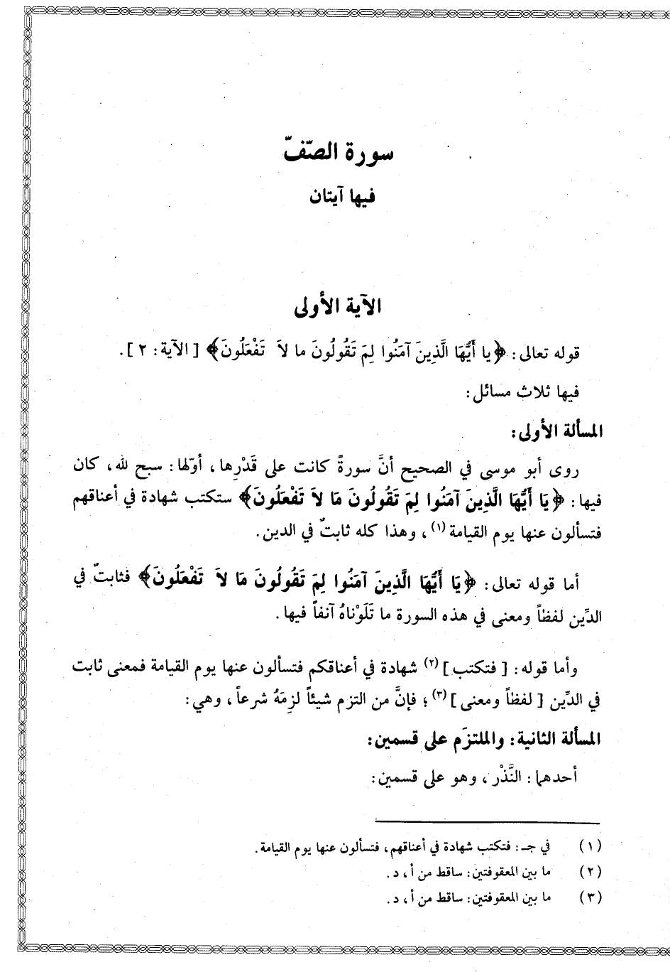 فِيهَا ثَلَاثُ مَسَائِلَ: الْمَسْأَلَةُ الْأُولَى رَوَى أَبُو مُوسَى فِي الصَّحِيحِ أَنَّ سُورَةً كَانَتْ عَلَى قَدْرِهَا، أَوَّلُهَا: سَبَّحَ لِلَّهِ، كَانَ فِيهَا: {يَا أَيُّهَا الَّذِينَ آمَنُوا لِمَ تَقُولُونَ مَا لا تَفْعَلُونَ} [الصف: 2] سَتُكْتَبُ شَهَادَةٌ فِي أَعْنَاقِهِمْ فَتُسْأَلُونَ عَنْهَا يَوْمَ الْقِيَامَةِ، وَهَذَا كُلُّهُ ثَابِتٌ فِي الدِّينِ.