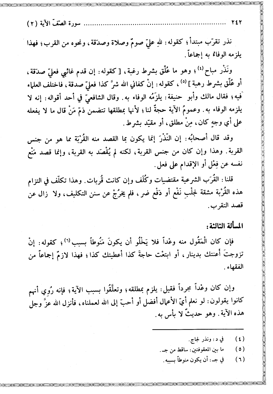 وَنَذْرِ مُبَاحٍ؛ وَهُوَ مَا عُلِّقَ بِشَرْطِ رَغْبَةٍ [كَقَوْلِهِ: إنْ قَدِمَ غَائِبِي فَعَلَيَّ صَدَقَةٌ، أَوْ عُلِّقَ بِشَرْطِ رَهْبَةٍ]، كَقَوْلِهِ: إنْ كَفَانِي اللَّهُ شَرَّ كَذَا فَعَلَيَّ صَدَقَةٌ، فَاخْتَلَفَ الْعُلَمَاءُ فِيهِ؛ فَقَالَ مَالِكٌ وَأَبُو حَنِيفَةَ: يَلْزَمُهُ الْوَفَاءُ بِهِ. وَقَالَ الشَّافِعِيُّ فِي أَحَدِ أَقْوَالِهِ: إنَّهُ لَا يَلْزَمُهُ الْوَفَاءُ بِهِ.