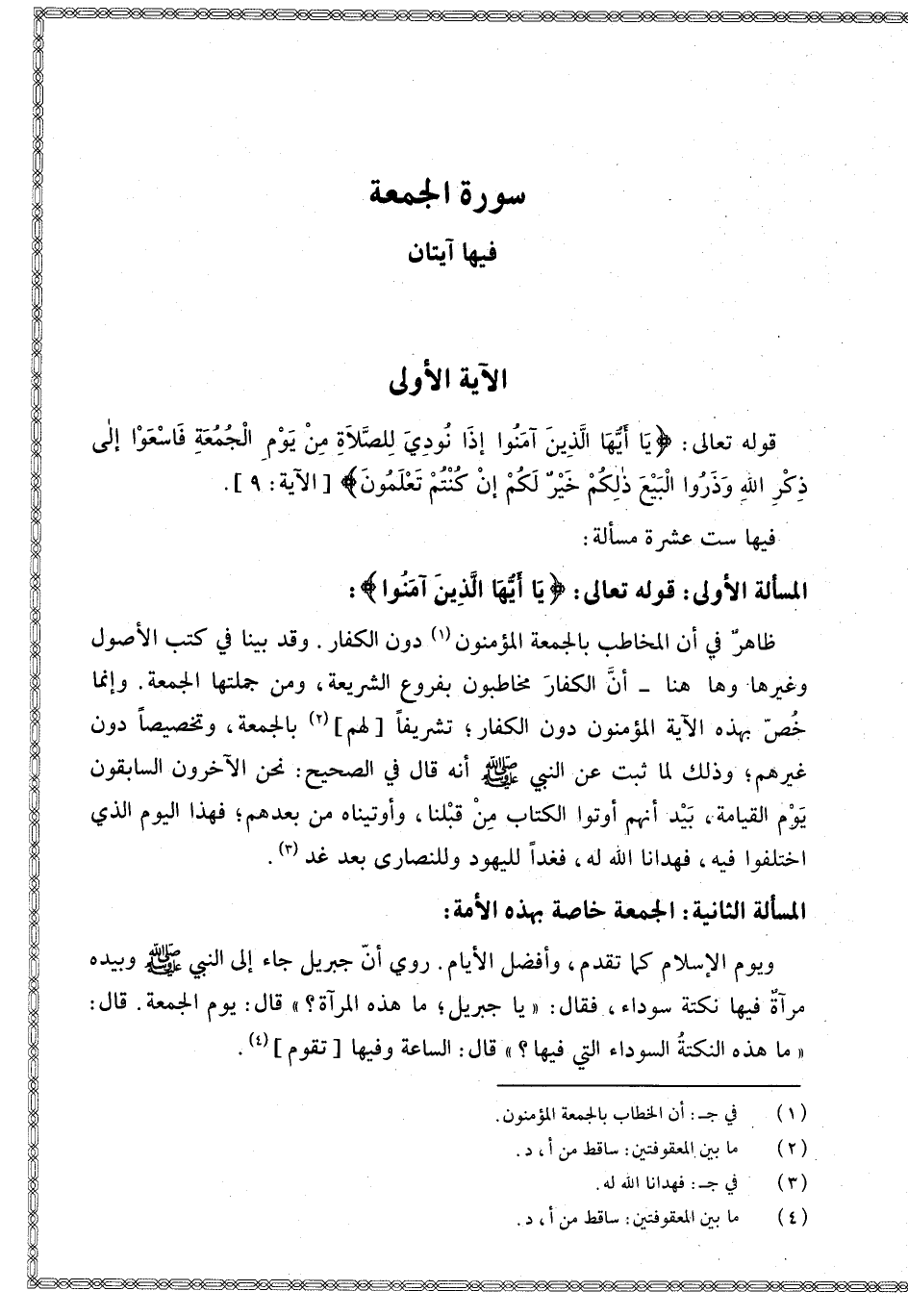 الْآيَةُ الْأُولَى قَوْله تَعَالَى: {يَا أَيُّهَا الَّذِينَ آمَنُوا إِذَا نُودِيَ لِلصَّلاةِ مِنْ يَوْمِ الْجُمُعَةِ فَاسْعَوْا إِلَى ذِكْرِ اللَّهِ وَذَرُوا الْبَيْعَ ذَلِكُمْ خَيْرٌ لَكُمْ إِنْ كُنْتُمْ تَعْلَمُونَ} [الجمعة: 9]. فِيهَا سِتَّ عَشْرَةَ مَسْأَلَةً: الْمَسْأَلَةُ الْأُولَى: قَوْلُهُ: {يَا أَيُّهَا الَّذِينَ آمَنُوا} [الجمعة: 9] ظَاهِرٌ فِي أَنَّ الْمُخَاطَبَ بِالْجُمُعَةِ الْمُؤْمِنُونَ دُونَ الْكُفَّارِ. وَقَدْ بَيَّنَّا ذَلِكَ فِي كُتُبِ الْأُصُولِ وَغَيْرِهَا وَهَا هُنَا أَنَّ الْكُفَّارَ مُخَاطَبُونَ بِفُرُوعِ الشَّرِيعَةِ، وَمِنْ جُمْلَتِهَا الْجُمُعَةُ. وَإِنَّمَا خُصَّ بِهَذِهِ الْآيَةِ الْمُؤْمِنُونَ دُونَ الْكُفَّارِ؛ تَشْرِيفًا [لَهُمْ] بِالْجُمُعَةِ، وَتَخْصِيصًا دُونَ غَيْرِهِمْ؛ وَذَلِكَ لِمَا ثَبَتَ عَنْ النَّبِيِّ - صَلَّى اللَّهُ عَلَيْهِ وَسَلَّمَ - أَنَّهُ قَالَ فِي الصَّحِيحِ: «نَحْنُ الْآخِرُونَ السَّابِقُونَ يَوْمَ الْقِيَامَةِ، بَيْدَ أَنَّهُمْ أُوتُوا الْكِتَابَ مِنْ قَبْلِنَا، وَأُوتِينَاهُ مِنْ بَعْدِهِمْ؛ فَهَذَا الْيَوْمُ الَّذِي اخْتَلَفُوا فِيهِ، فَهَدَانَا اللَّهُ لَهُ، فَغَدًا لِلْيَهُودِ وَلِلنَّصَارَى بَعْدَ غَدٍ».