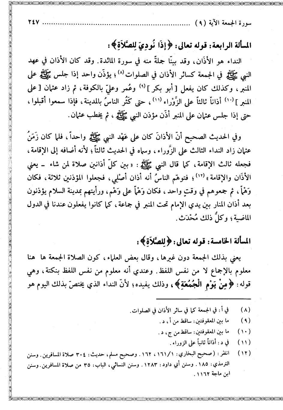 الْمَسْأَلَةُ الرَّابِعَةُ قَوْلُهُ: {إِذَا نُودِيَ لِلصَّلاةِ} [الجمعة: 9]: النِّدَاءُ هُوَ الْأَذَانُ، وَقَدْ بَيَّنَّا جُمْلَةً مِنْهُ فِي سُورَةِ الْمَائِدَةِ. وَقَدْ «كَانَ الْأَذَانُ فِي عَهْدِ النَّبِيِّ - صَلَّى اللَّهُ عَلَيْهِ وَسَلَّمَ - فِي الْجُمُعَةِ كَسَائِرِ الْأَذَانِ فِي الصَّلَوَاتِ؛ يُؤَذِّنُ وَاحِدٌ إذَا جَلَسَ - صَلَّى اللَّهُ عَلَيْهِ وَسَلَّمَ - عَلَى الْمِنْبَرِ، وَكَذَلِكَ كَانَ يَفْعَلُ أَبُو بَكْرٍ وَعُمَرُ وَعَلِيٌّ بِالْكُوفَةِ، ثُمَّ زَادَ عُثْمَانُ عَلَى الْمِنْبَرِ أَذَانًا ثَالِثًا عَلَى الزَّوْرَاءِ، حَتَّى كَثُرَ النَّاسُ بِالْمَدِينَةِ، فَإِذَا سَمِعُوا أَقْبَلُوا، حَتَّى إذَا جَلَسَ عُثْمَانُ عَلَى الْمِنْبَرِ أَذَّنَ مُؤَذِّنُ النَّبِيِّ - صَلَّى اللَّهُ عَلَيْهِ وَسَلَّمَ - ثُمَّ يَخْطُبُ عُثْمَانُ.»