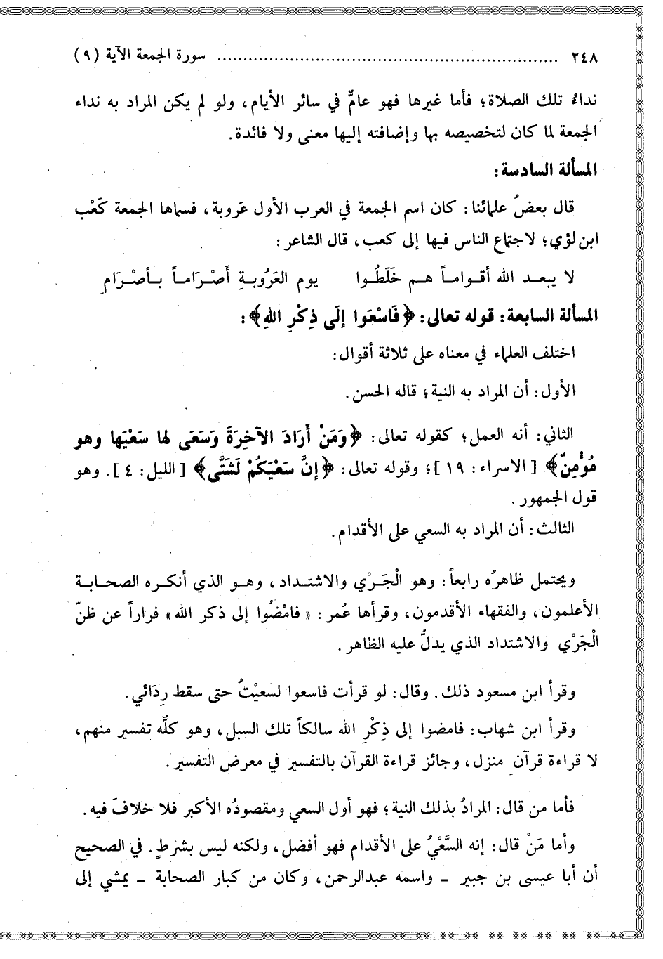 الْمَسْأَلَةُ السَّابِعَةُ قَوْلُهُ {فَاسْعَوْا إِلَى ذِكْرِ اللَّهِ} [الجمعة: 9]: اخْتَلَفَ الْعُلَمَاءُ فِي مَعْنَاهُ عَلَى ثَلَاثَةِ أَقْوَالٍ: الْأَوَّلُ: أَنَّ الْمُرَادَ بِهِ النِّيَّةُ؛ قَالَهُ الْحَسَنُ.