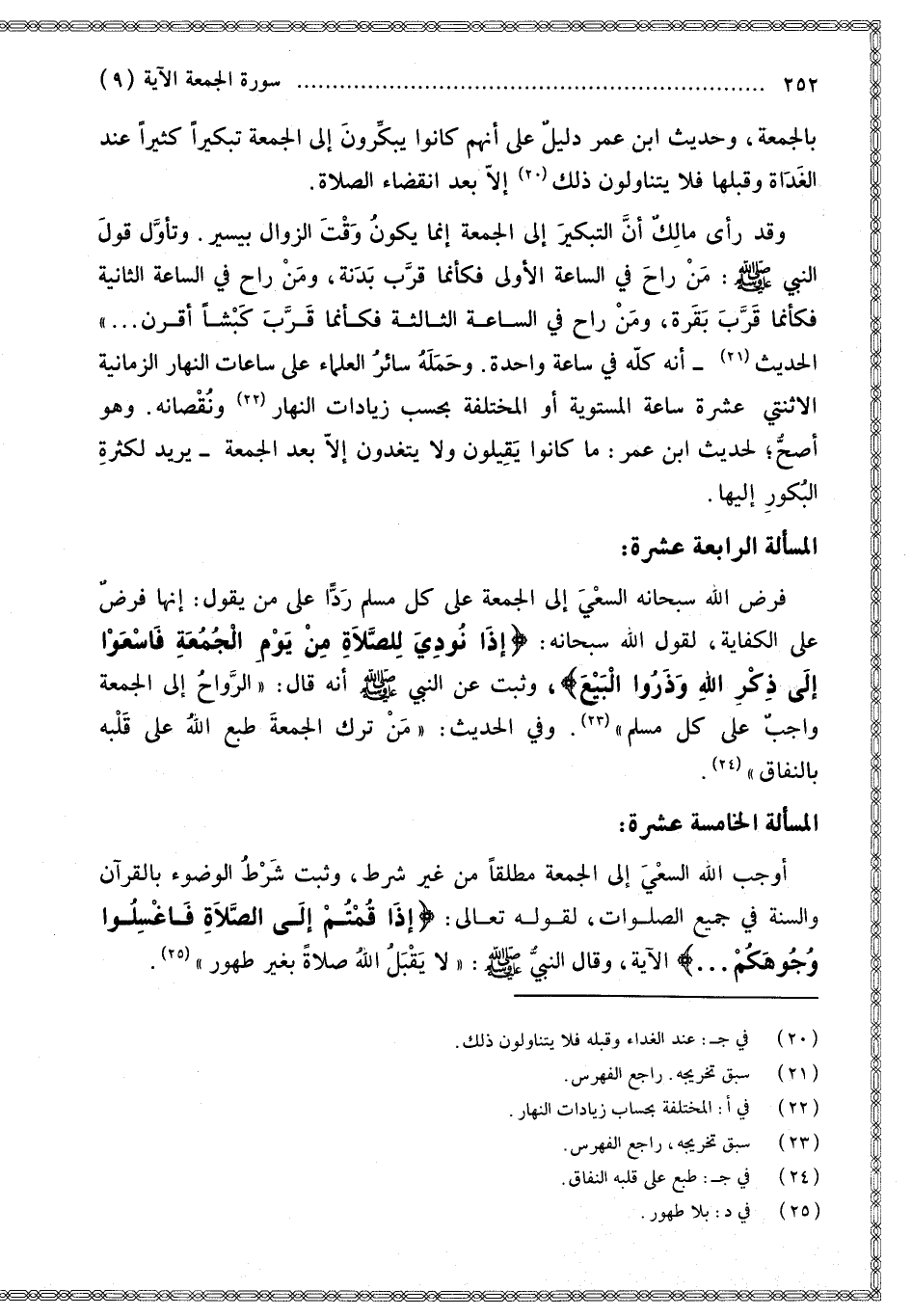 الْمَسْأَلَةُ الرَّابِعَةَ عَشْرَةَ فَرَضَ اللَّهُ سُبْحَانَهُ السَّعْيَ إلَى الْجُمُعَةِ عَلَى كُلِّ مُسْلِمٍ رَدًّا عَلَى مَنْ يَقُولُ: إنَّهَا فَرْضٌ عَلَى الْكِفَايَةِ، لِقَوْلِ اللَّهِ سُبْحَانَهُ: {إِذَا نُودِيَ لِلصَّلاةِ مِنْ يَوْمِ الْجُمُعَةِ فَاسْعَوْا إِلَى ذِكْرِ اللَّهِ وَذَرُوا الْبَيْعَ} [الجمعة: 9] وَثَبَتَ عَنْ النَّبِيِّ - صَلَّى اللَّهُ عَلَيْهِ وَسَلَّمَ - أَنَّهُ قَالَ: «الرَّوَاحُ إلَى الْجُمُعَةِ وَاجِبٌ عَلَى كُلِّ مُسْلِمٍ.» وَفِي الْحَدِيثِ: «مَنْ تَرَكَ الْجُمُعَةَ طَبَعَ اللَّهُ عَلَى قَلْبِهِ بِالنِّفَاقِ.» الْمَسْأَلَةُ الْخَامِسَةَ عَشْرَةَ أَوْجَبَ اللَّهُ السَّعْيَ إلَى الْجُمُعَةِ مُطْلَقًا مِنْ غَيْرِ شَرْطٍ، وَثَبَتَ شَرْطُ الْوُضُوءِ بِالْقُرْآنِ وَالسُّنَّةِ فِي جَمِيعِ الصَّلَوَاتِ، لِقَوْلِهِ تَعَالَى: {إِذَا قُمْتُمْ إِلَى الصَّلاةِ فَاغْسِلُوا وُجُوهَكُمْ} [المائدة: 6] الْآيَةُ، وَقَالَ النَّبِيُّ - صَلَّى اللَّهُ عَلَيْهِ وَسَلَّمَ -: «لَا يَقْبَلُ اللَّهُ صَلَاةً بِغَيْرِ طَهُورٍ».