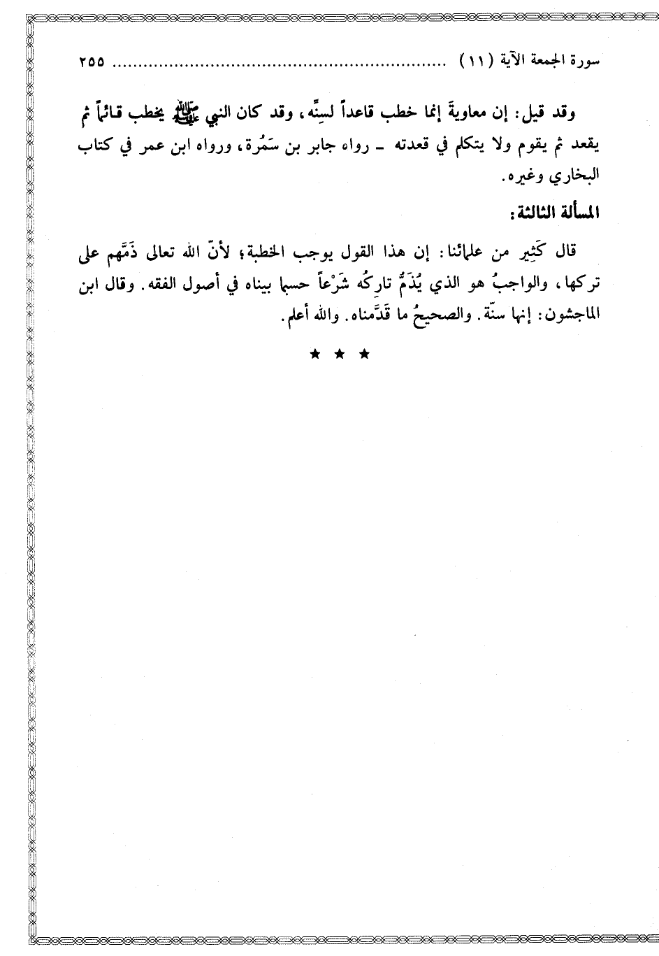 وَقَدْ قِيلَ: إنَّ مُعَاوِيَةَ إنَّمَا خَطَبَ قَاعِدًا لِسِنِّهِ، وَقَدْ كَانَ النَّبِيُّ - صَلَّى اللَّهُ عَلَيْهِ وَسَلَّمَ - يَخْطُبُ قَائِمًا ثُمَّ يَقْعُدُ ثُمَّ يَقُومُ وَلَا يَتَكَلَّمُ فِي قَعْدَتِهِ رَوَاهُ جَابِرُ بْنُ سَمُرَةَ، وَرَوَاهُ ابْنُ عُمَرَ فِي كِتَابِ الْبُخَارِيِّ وَغَيْرِهِ. الْمَسْأَلَةُ الثَّالِثَةُ قَالَ كَثِيرٌ مِنْ عُلَمَائِنَا: إنَّ هَذَا الْقَوْلَ يُوجِبُ الْخُطْبَةَ؛ لِأَنَّ اللَّهَ تَعَالَى ذَمَّهُمْ عَلَى تَرْكِهَا، وَالْوَاجِبُ هُوَ الَّذِي يُذَمُّ تَارِكُهُ شَرْعًا حَسْبَمَا بَيَّنَّاهُ فِي أُصُولِ الْفِقْهِ. وَقَالَ ابْنُ الْمَاجِشُونِ: إنَّهَا سُنَّةٌ. وَالصَّحِيحُ مَا قَدَّمْنَاهُ. وَاَللَّهُ أَعْلَمُ.