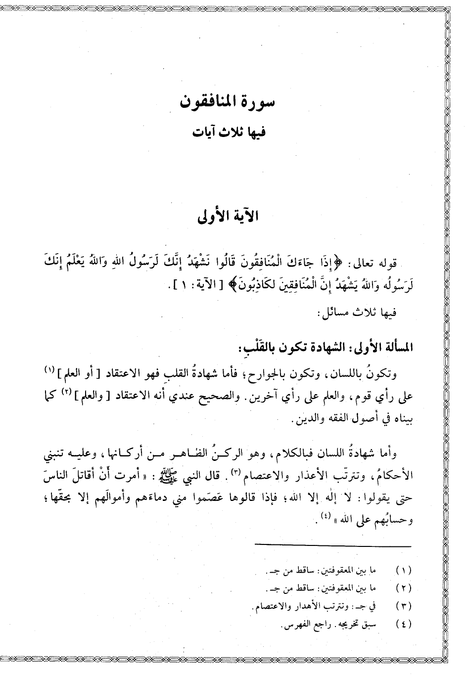 فِيهَا ثَلَاثُ مَسَائِلَ: الْمَسْأَلَةُ الْأُولَى الشَّهَادَةُ تَكُونُ بِالْقَلْبِ؛ وَتَكُونُ بِاللِّسَانِ، وَتَكُونُ بِالْجَوَارِحِ؛ فَأَمَّا شَهَادَةُ الْقَلْبِ فَهُوَ الِاعْتِقَادُ [أَوْ الْعِلْمُ] عَلَى رَأْيِ قَوْمٍ، وَالْعِلْمُ عَلَى رَأْيِ آخَرِينَ. وَالصَّحِيحُ عِنْدِي أَنَّهُ الِاعْتِقَادُ [وَالْعِلْمُ] كَمَا بَيَّنَّا فِي أُصُولِ الْفِقْهِ وَالدِّينِ.