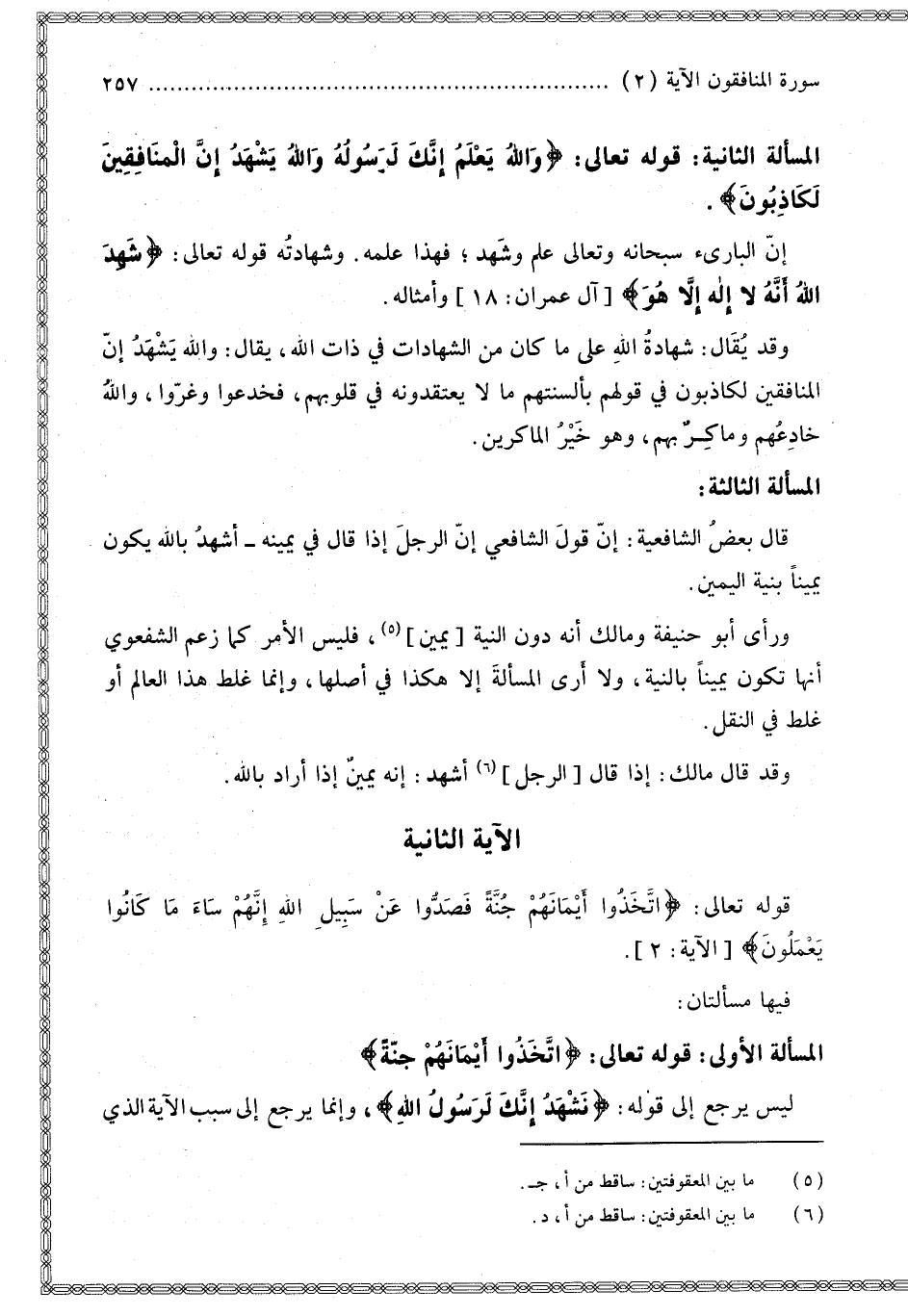 فِيهَا مَسْأَلَتَانِ: الْمَسْأَلَةُ الْأُولَى قَوْله تَعَالَى: {اتَّخَذُوا أَيْمَانَهُمْ جُنَّةً} [المنافقون: 2] لَيْسَ يَرْجِعُ إلَى قَوْلِهِ: {نَشْهَدُ إِنَّكَ لَرَسُولُ اللَّهِ} [المنافقون: 1] وَإِنَّمَا يَرْجِعُ إلَى سَبَبِ الْآيَةِ الَّذِي
