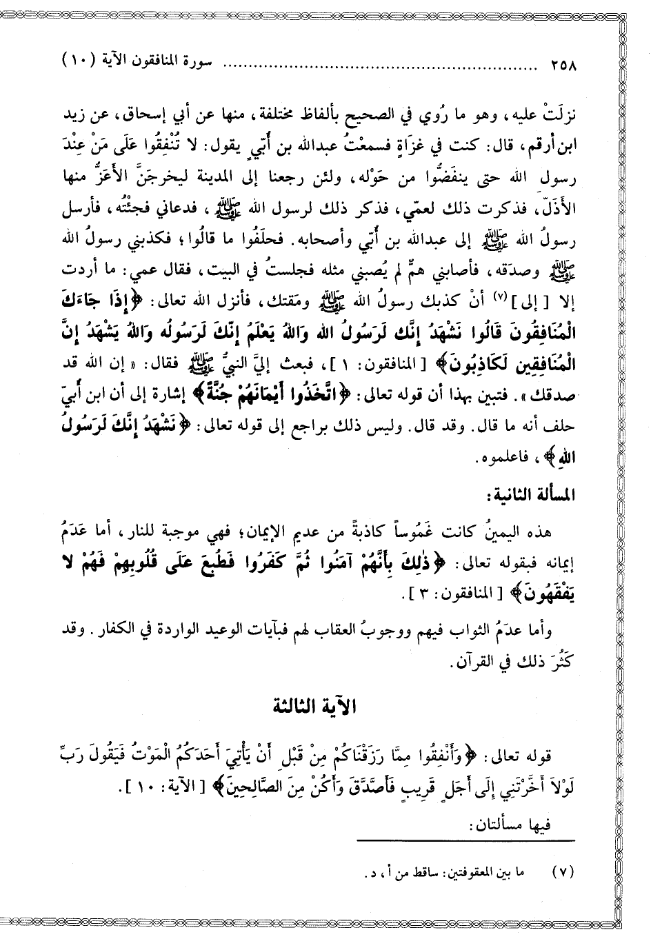 الْآيَةُ الثَّالِثَةُ قَوْله تَعَالَى: {وَأَنْفِقُوا مِنْ مَا رَزَقْنَاكُمْ مِنْ قَبْلِ أَنْ يَأْتِيَ أَحَدَكُمُ الْمَوْتُ فَيَقُولَ رَبِّ لَوْلا أَخَّرْتَنِي إِلَى أَجَلٍ قَرِيبٍ فَأَصَّدَّقَ وَأَكُنْ مِنَ الصَّالِحِينَ} [المنافقون: 10]. فِيهَا مَسْأَلَتَانِ: