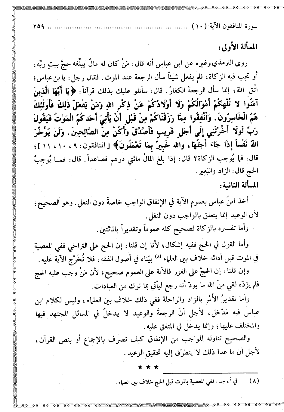 الْمَسْأَلَةُ الْأُولَى رَوَى التِّرْمِذِيُّ وَغَيْرُهُ عَنْ ابْنِ عَبَّاسٍ أَنَّهُ قَالَ: مَنْ كَانَ لَهُ مَالٌ يُبَلِّغُهُ حَجَّ بَيْتِ رَبِّهِ، أَوْ تَجِبُ فِيهِ الزَّكَاةُ فَلَمْ يَفْعَلْ شَيْئًا سَأَلَ الرَّجْعَةَ عِنْدَ الْمَوْتِ. فَقَالَ رَجُلٌ: يَا ابْنَ عَبَّاسٍ؛ اتَّقِ اللَّهَ؛ إنَّمَا سَأَلَ الرَّجْعَةَ الْكُفَّارُ. قَالَ: سَأَتْلُو عَلَيْك بِذَلِكَ قُرْآنًا: {يَا أَيُّهَا الَّذِينَ آمَنُوا لا تُلْهِكُمْ أَمْوَالُكُمْ وَلا أَوْلادُكُمْ عَنْ ذِكْرِ اللَّهِ وَمَنْ يَفْعَلْ ذَلِكَ فَأُولَئِكَ هُمُ الْخَاسِرُونَ} [المنافقون: 9] {وَأَنْفِقُوا مِنْ مَا رَزَقْنَاكُمْ مِنْ قَبْلِ أَنْ يَأْتِيَ أَحَدَكُمُ الْمَوْتُ فَيَقُولَ رَبِّ لَوْلا أَخَّرْتَنِي إِلَى أَجَلٍ قَرِيبٍ فَأَصَّدَّقَ وَأَكُنْ مِنَ الصَّالِحِينَ - وَلَنْ يُؤَخِّرَ اللَّهُ نَفْسًا إِذَا جَاءَ أَجَلُهَا وَاللَّهُ خَبِيرٌ بِمَا تَعْمَلُونَ} [المنافقون: 10 - 11] قَالَ: فَمَا يُوجِبُ الزَّكَاةَ؟ قَالَ: إذَا بَلَغَ الْمَالُ مِائَتَيْ دِرْهَمٍ فَصَاعِدًا. قَالَ: فَمَا يُوجِبُ الْحَجَّ؟ قَالَ: الزَّادُ وَالْبَعِيرُ.