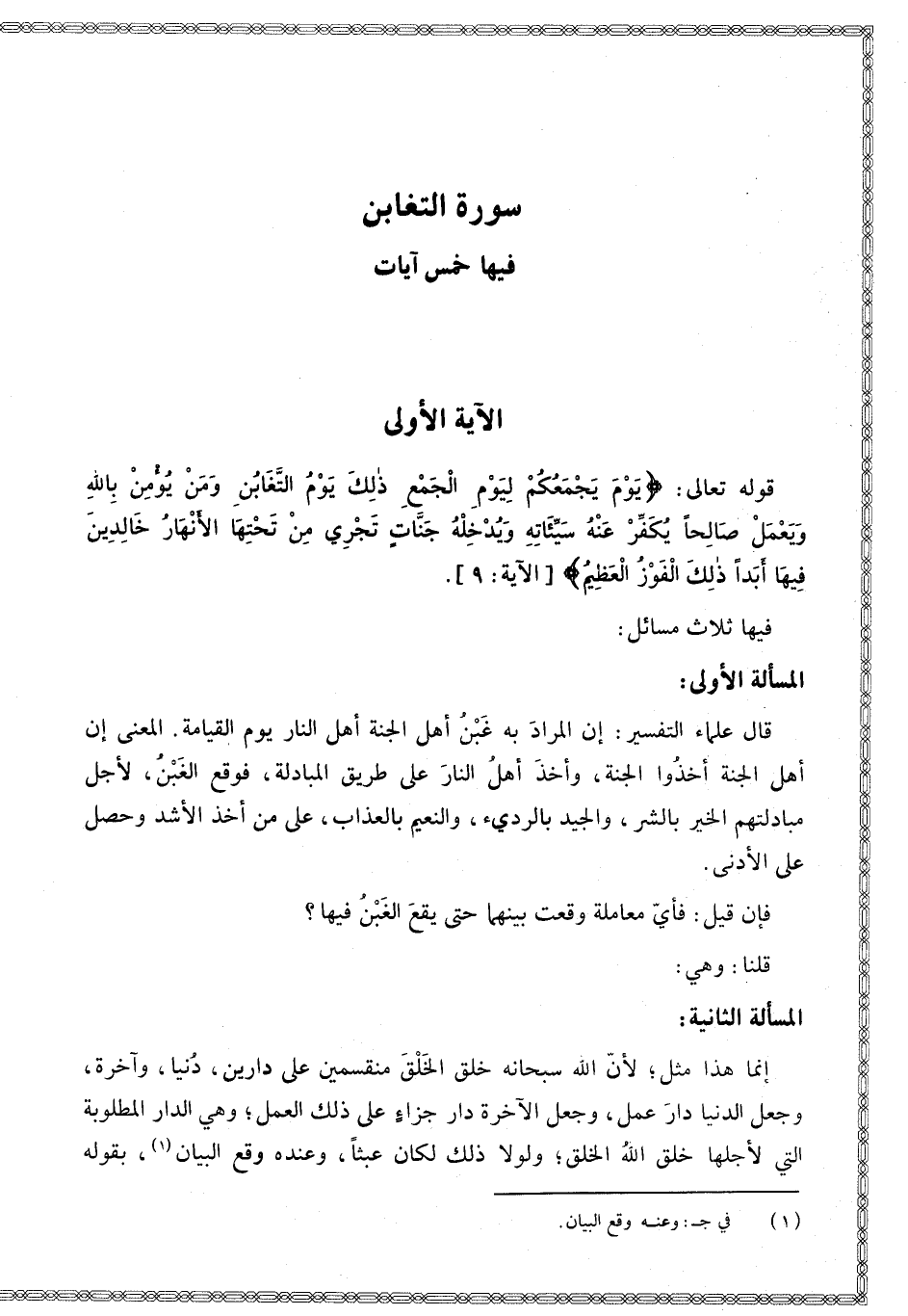 الْمَسْأَلَةُ الْأُولَى قَالَ عُلَمَاءُ التَّفْسِيرِ: إنَّ الْمُرَادَ بِهِ غَبْنُ أَهْلِ الْجَنَّةِ أَهْلَ النَّارِ يَوْمَ الْقِيَامَةِ. الْمَعْنَى أَنَّ أَهْلَ الْجَنَّةِ أَخَذُوا الْجَنَّةَ، وَأَخَذَ أَهْلُ النَّارِ النَّارَ عَلَى طَرِيقِ الْمُبَادَلَةِ، فَوَقَعَ الْغَبْنُ، لِأَجْلِ مُبَادَلَتِهِمْ الْخَيْرَ بِالشَّرِّ، وَالْجَيِّدَ بِالرَّدِيءِ، وَالنَّعِيمَ بِالْعَذَابِ، عَلَى مَنْ أَخَذَ الْأَشَدَّ وَحَصَلَ عَلَى الْأَدْنَى.