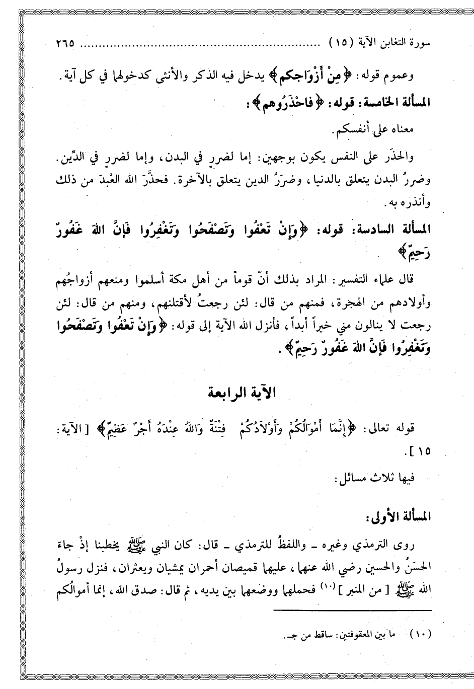 فِيهَا ثَلَاثُ مَسَائِلَ: الْمَسْأَلَةُ الْأُولَى رَوَى التِّرْمِذِيُّ وَغَيْرُهُ وَاللَّفْظُ لِلتِّرْمِذِيِّ قَالَ: «كَانَ النَّبِيُّ - صَلَّى اللَّهُ عَلَيْهِ وَسَلَّمَ - يَخْطُبُنَا إذْ جَاءَ الْحَسَنُ وَالْحُسَيْنُ - رَضِيَ اللَّهُ عَنْهُمَا -، عَلَيْهِمَا قَمِيصَانِ أَحْمَرَانِ يَمْشِيَانِ وَيَعْثُرَانِ، فَنَزَلَ رَسُولُ اللَّهِ - صَلَّى اللَّهُ عَلَيْهِ وَسَلَّمَ - مِنْ الْمِنْبَرِ فَحَمَلَهُمَا وَوَضَعَهُمَا بَيْنَ يَدَيْهِ، ثُمَّ قَالَ: صَدَقَ اللَّهُ، إنَّمَا أَمْوَالُكُمْ