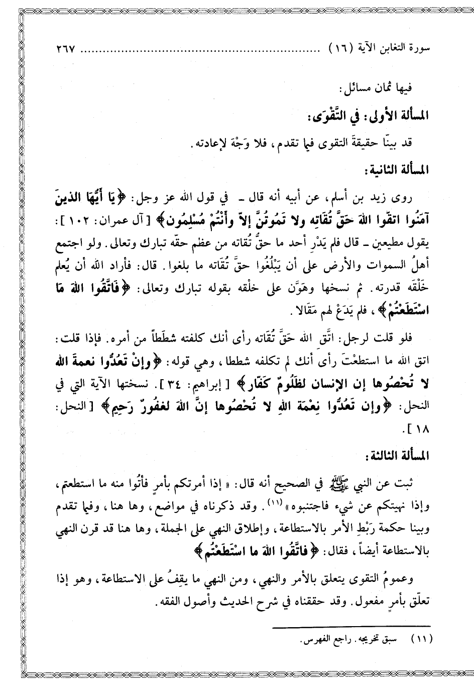 وَقَدْ ذَكَرْنَاهُ فِي مَوَاضِعَ، وَهَا هُنَا، فِيمَا تَقَدَّمَ وَبَيَّنَّا حِكْمَةَ رَبْطِ الْأَمْرِ بِالِاسْتِطَاعَةِ، وَإِطْلَاقِ النَّهْيِ عَلَى الْجُمْلَةِ، وَهَا هُنَا قَدْ قَرَنَ النَّهْيَ بِالِاسْتِطَاعَةِ أَيْضًا، فَقَالَ: {فَاتَّقُوا اللَّهَ مَا اسْتَطَعْتُمْ} [التغابن: 16]. وَعُمُومُ التَّقْوَى يَتَعَلَّقُ بِالْأَمْرِ وَالنَّهْيِ، وَمِنْ النَّهْيِ مَا يَقِفُ عَلَى الِاسْتِطَاعَةِ، وَهُوَ إذًا
