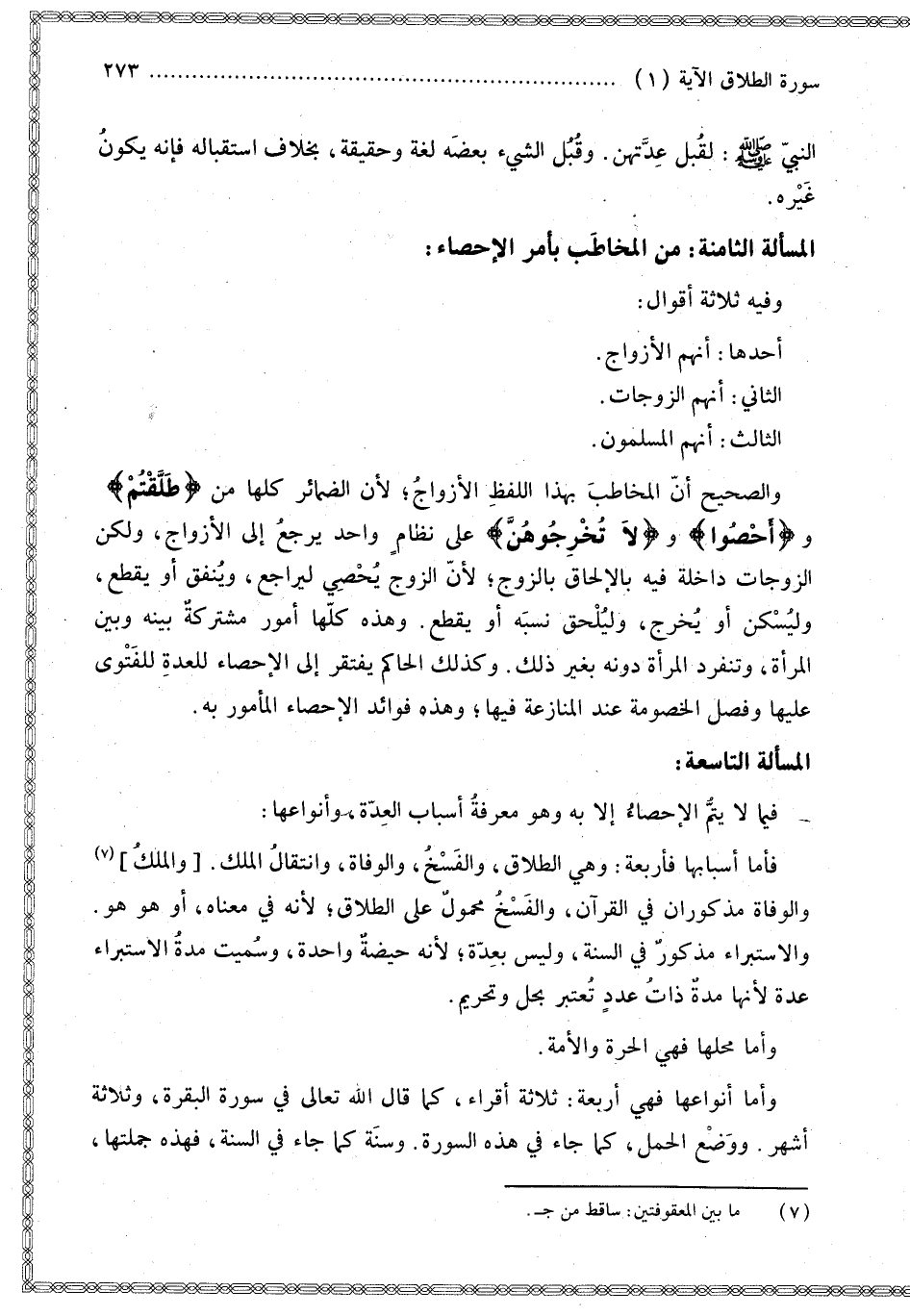 الْمَسْأَلَةُ الثَّامِنَةُ مَنْ الْمُخَاطَبُ بِأَمْرِ الْإِحْصَاءِ؛ وَفِيهِ ثَلَاثَةُ أَقْوَالٍ: أَحَدُهَا أَنَّهُمْ الْأَزْوَاجُ.