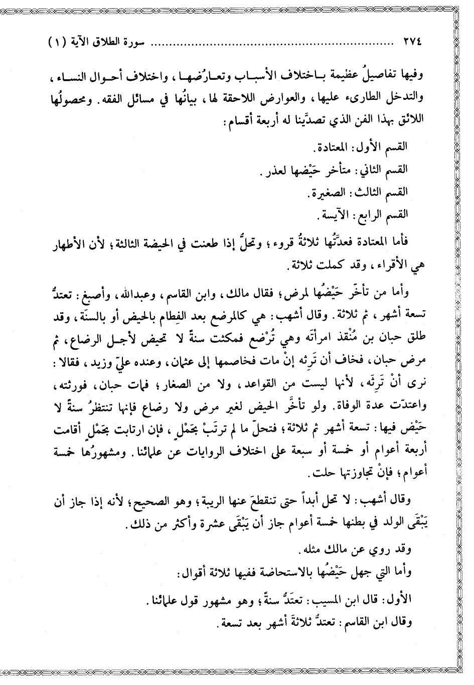 وَفِيهَا تَفَاصِيلُ عَظِيمَةٌ بِاخْتِلَافِ الْأَسْبَابِ وَتَعَارُضِهَا، وَاخْتِلَافُ أَحْوَالِ النِّسَاءِ، وَالتَّدَخُّلُ الطَّارِئُ عَلَيْهَا، وَالْعَوَارِضُ اللَّاحِقَةُ لَهَا، بَيَانُهَا فِي مَسَائِلِ الْفِقْهِ. وَمَحْصُولُهَا اللَّائِقُ بِهَذَا الْفَنِّ الَّذِي تَصَدَّيْنَا لَهُ أَرْبَعَةُ أَقْسَامٍ: الْقِسْمُ الْأَوَّلُ: الْمُعْتَادَةُ.