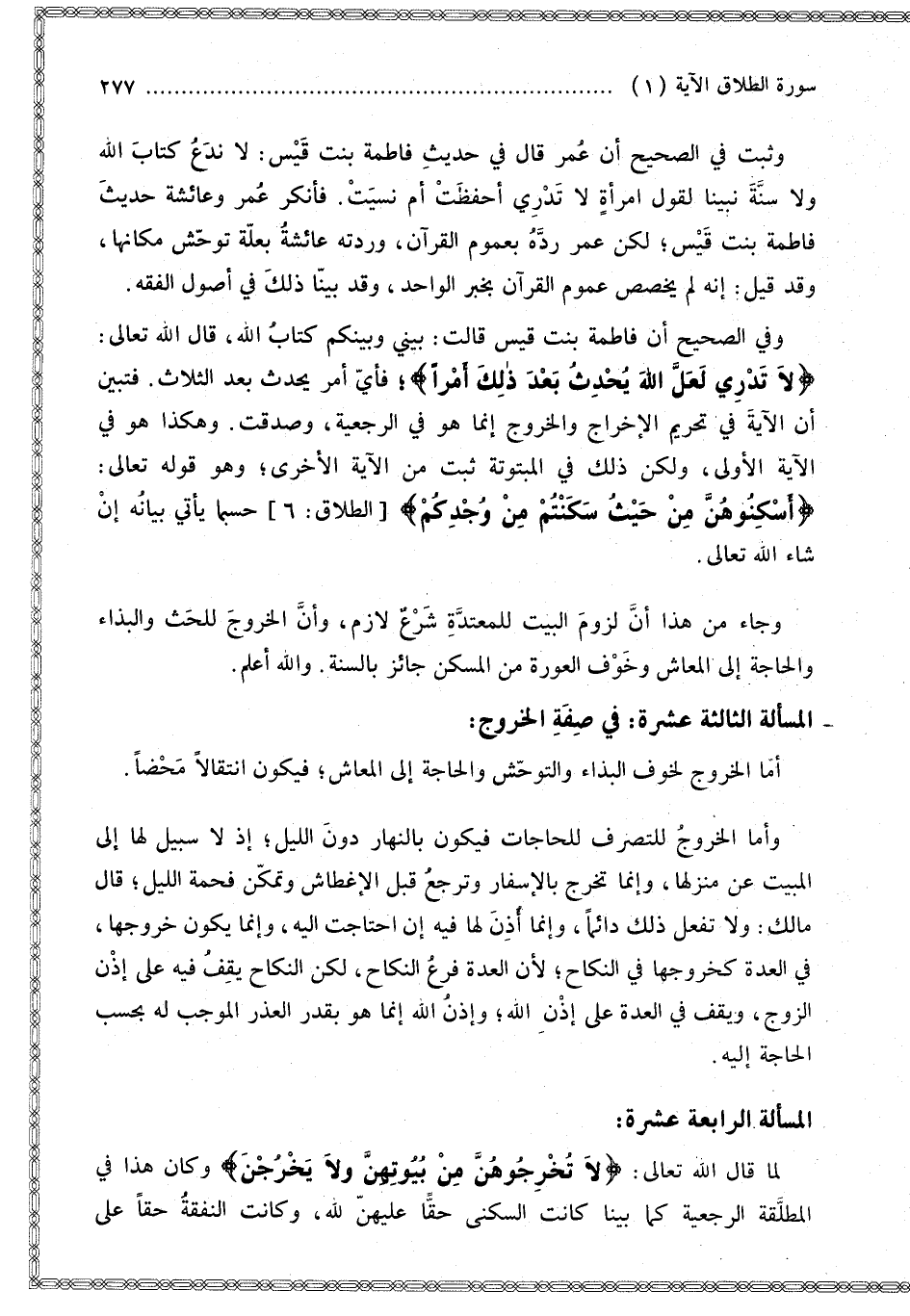 وَفِي الصَّحِيحِ أَنَّ فَاطِمَةَ بِنْتَ قَيْسٍ قَالَتْ: بَيْنِي وَبَيْنَكُمْ كِتَابُ اللَّهِ قَالَ اللَّهُ تَعَالَى: {لا تَدْرِي لَعَلَّ اللَّهَ يُحْدِثُ بَعْدَ ذَلِكَ أَمْرًا} [الطلاق: 1]؛ فَأَيُّ أَمْرٍ يَحْدُثُ بَعْدَ الثَّلَاثِ. فَتَبَيَّنَ أَنَّ الْآيَةَ فِي تَحْرِيمِ الْإِخْرَاجِ وَالْخُرُوجُ إنَّمَا هُوَ فِي الرَّجْعِيَّةِ، وَصَدَقَتْ. وَهَكَذَا هُوَ فِي الْآيَةِ الْأُولَى، وَلَكِنَّ ذَلِكَ فِي الْمَبْتُوتَةِ ثَبَتَ مِنْ الْآيَةِ الْأُخْرَى؛ وَهُوَ قَوْله تَعَالَى: {أَسْكِنُوهُنَّ مِنْ حَيْثُ سَكَنْتُمْ مِنْ وُجْدِكُمْ} [الطلاق: 6] حَسْبَمَا يَأْتِي بَيَانُهُ إنْ شَاءَ اللَّهُ تَعَالَى.