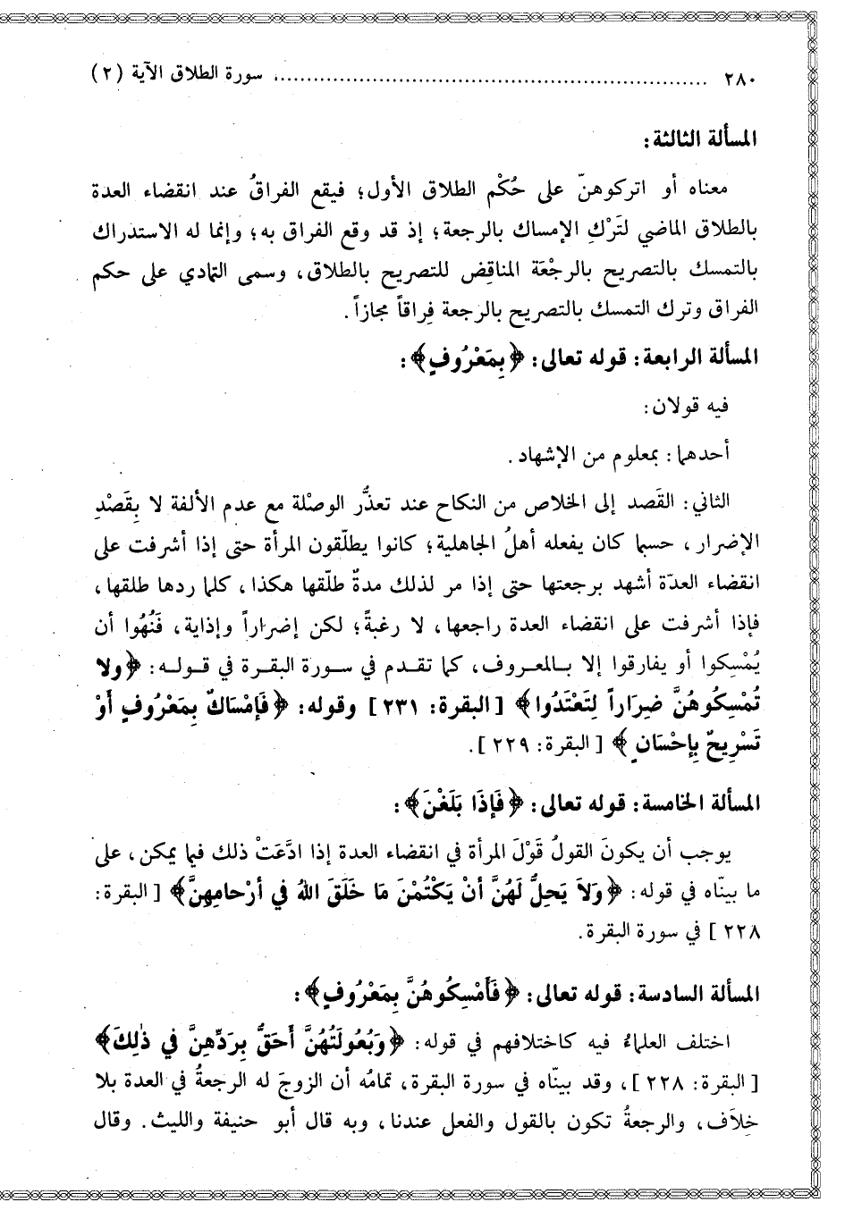 وَقَوْلِهِ: {فَإِمْسَاكٌ بِمَعْرُوفٍ أَوْ تَسْرِيحٌ بِإِحْسَانٍ} [البقرة: 229]. الْمَسْأَلَةُ الْخَامِسَةُ قَوْلُهُ: {فَإِذَا بَلَغْنَ} [الطلاق: 2]: يُوجِبُ أَنْ يَكُونَ الْقَوْلُ قَوْلَ الْمَرْأَةِ فِي انْقِضَاءِ الْعِدَّةِ إذَا ادَّعَتْ ذَلِكَ فِيمَا يُمْكِنُ، عَلَى مَا بَيَّنَّاهُ فِي قَوْلِهِ: {وَلا يَحِلُّ لَهُنَّ أَنْ يَكْتُمْنَ مَا خَلَقَ اللَّهُ فِي أَرْحَامِهِنَّ} [البقرة: 228] فِي سُورَةِ الْبَقَرَةِ. الْمَسْأَلَةُ السَّادِسَةُ {فَأَمْسِكُوهُنَّ بِمَعْرُوفٍ} [الطلاق: 2]: اخْتَلَفَ الْعُلَمَاءُ فِيهِ كَاخْتِلَافِهِمْ فِي قَوْلِهِ: {وَبُعُولَتُهُنَّ أَحَقُّ بِرَدِّهِنَّ فِي ذَلِكَ} [البقرة: 228] وَقَدْ بَيَّنَّاهُ فِي سُورَةِ الْبَقَرَةِ، تَمَامُهُ أَنَّ الزَّوْجَ لَهُ الرَّجْعَةُ فِي الْعِدَّةِ بِلَا خِلَافٍ، وَالرَّجْعَةُ تَكُونُ بِالْقَوْلِ وَالْفِعْلِ عِنْدَنَا، وَبِهِ قَالَ أَبُو حَنِيفَةَ وَاللَّيْثُ. وَقَالَ