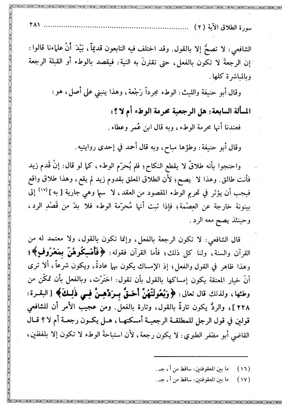 قَالَ الشَّافِعِيُّ: لَا تَكُونُ الرَّجْعَةُ بِالْفِعْلِ، وَإِنَّمَا تَكُونُ بِالْقَوْلِ وَلَا مُعْتَمَدَ لَهُ مِنْ الْقُرْآنِ وَالسُّنَّةِ، وَلَنَا كُلُّ ذَلِكَ؛ فَأَمَّا الْقُرْآنُ فَقَوْلُهُ: {فَأَمْسِكُوهُنَّ بِمَعْرُوفٍ} [الطلاق: 2]؛ وَهَذَا ظَاهِرٌ فِي الْقَوْلِ وَالْفِعْلِ؛ إذْ الْإِمْسَاكُ يَكُونُ بِهِمَا عَادَةً، وَيَكُونُ شَرْعًا، أَلَا تَرَى أَنَّ خِيَارَ الْمُعْتَقَةِ يَكُونُ إمْسَاكُهَا بِالْقَوْلِ بِأَنْ تَقُولَ: اخْتَرْت، وَبِالْفِعْلِ بِأَنْ تُمَكِّنَ مِنْ وَطْئِهَا، وَلِذَلِكَ قَالَ تَعَالَى: {وَبُعُولَتُهُنَّ أَحَقُّ بِرَدِّهِنَّ فِي ذَلِكَ} [البقرة: 228] وَالرَّدُّ يَكُونُ تَارَةً بِالْقَوْلِ، وَتَارَةً بِالْفِعْلِ.