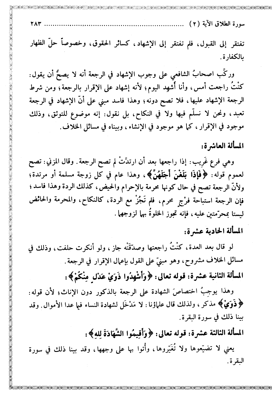 الْمَسْأَلَةُ الثَّانِيَةَ عَشْرَةَ قَوْله تَعَالَى: {وَأَشْهِدُوا ذَوَيْ عَدْلٍ مِنْكُمْ} [الطلاق: 2]: وَهَذَا يُوجِبُ اخْتِصَاصَ الشَّهَادَةِ عَلَى الرَّجْعَةِ بِالذُّكُورِ دُونَ الْإِنَاثِ؛ لِأَنَّ قَوْلَهُ: {ذَوَيْ} [الطلاق: 2] مُذَكَّرٌ، وَلِذَلِكَ قَالَ عُلَمَاؤُنَا: لَا مَدْخَلَ لِشَهَادَةِ النِّسَاءِ فِيمَا عَدَا الْأَمْوَالَ. وَقَدْ بَيَّنَّا ذَلِكَ فِي سُورَةِ الْبَقَرَةِ الْمَسْأَلَةُ الثَّالِثَةَ عَشْرَةَ قَوْله تَعَالَى: {وَأَقِيمُوا الشَّهَادَةَ لِلَّهِ} [الطلاق: 2]: يَعْنِي لَا تُضَيِّعُوهَا وَلَا تُغَيِّرُوهَا، وَأْتُوا بِهَا عَلَى وَجْهِهَا، وَقَدْ بَيَّنَّا ذَلِكَ فِي سُورَةِ الْبَقَرَةِ.