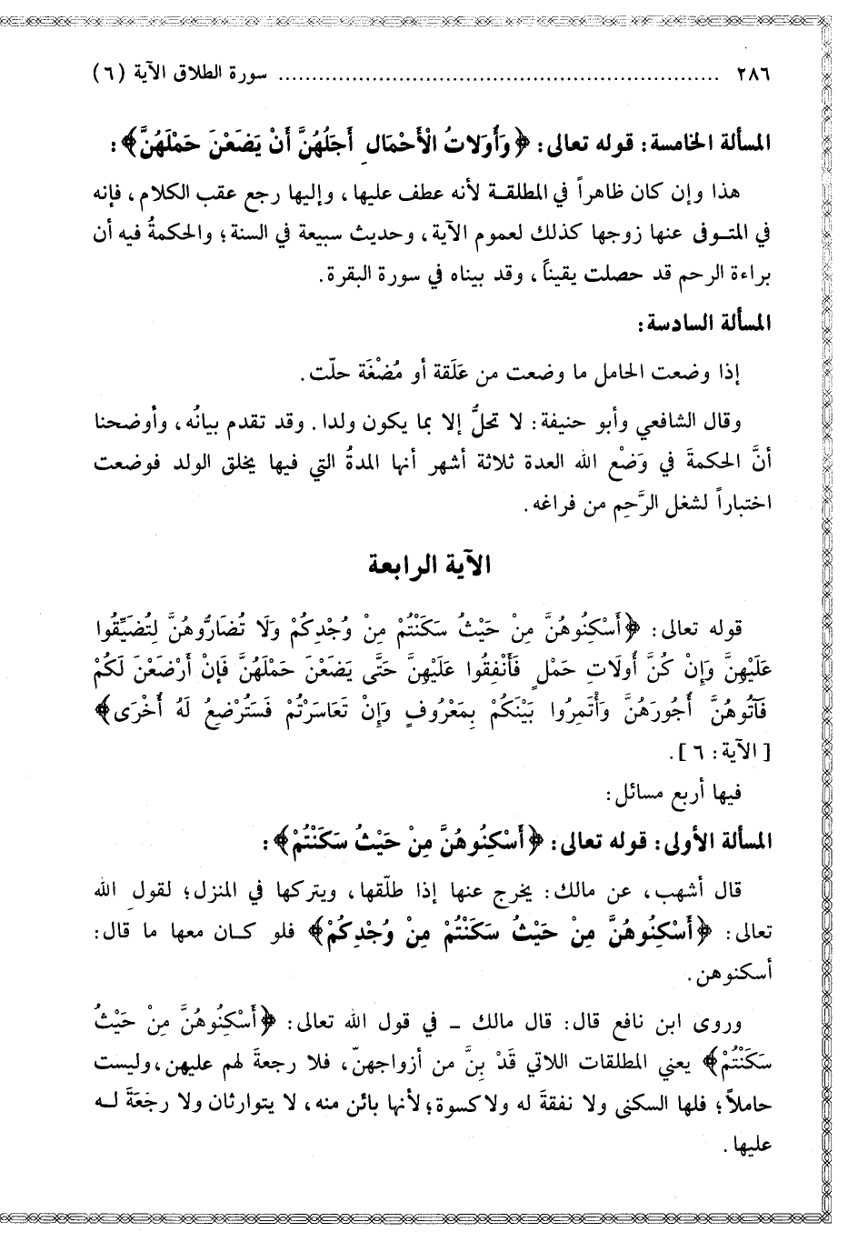 [الْآيَة الرَّابِعَة قَوْله تَعَالَى أَسْكِنُوهُنَّ مِنْ حَيْثُ سَكَنْتُمْ مِنْ وُجْدِكُمْ وَلَا تُضَارُّوهُنَّ]