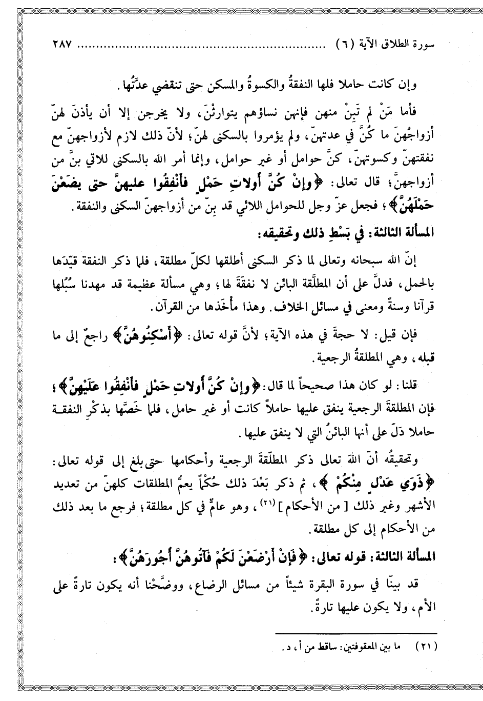 الْمَسْأَلَةُ الثَّانِيَةُ فِي بَسْطِ ذَلِكَ وَتَحْقِيقِهِ: أَنَّ اللَّهَ سُبْحَانَهُ وَتَعَالَى لَمَّا ذَكَرَ السُّكْنَى أَطْلَقَهَا لِكُلِّ مُطَلَّقَةٍ، فَلَمَّا ذَكَرَ النَّفَقَةَ قَيَّدَهَا بِالْحَمْلِ، فَدَلَّ عَلَى أَنَّ الْمُطَلَّقَةَ الْبَائِنَ لَا نَفَقَةَ لَهَا؛ وَهِيَ مَسْأَلَةٌ عَظِيمَةٌ قَدْ مَهَّدْنَا سُبُلَهَا قُرْآنًا وَسُنَّةً وَمَعْنًى فِي مَسَائِلِ الْخِلَافِ. وَهَذَا مَأْخَذُهَا مِنْ الْقُرْآنِ.