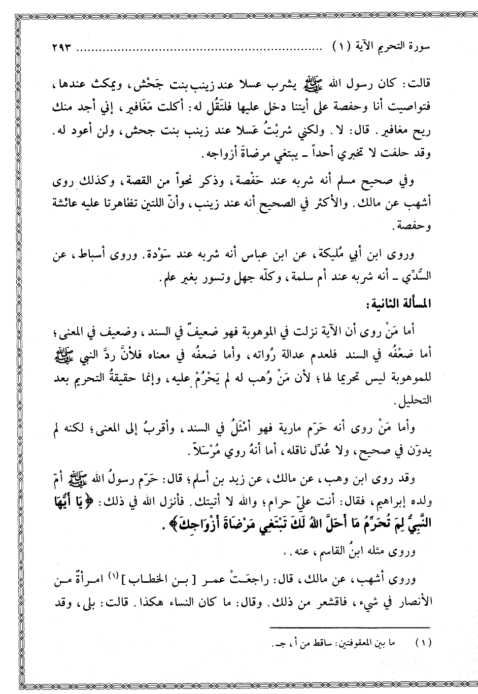 وَرَوَى ابْنُ أَبِي مُلَيْكَةَ عَنْ ابْنِ عَبَّاسٍ أَنَّهُ شَرِبَهُ عِنْدَ سَوْدَةَ. وَرَوَى أَسْبَاطٌ عَنْ السُّدِّيِّ أَنَّهُ شَرِبَهُ عِنْدَ أُمِّ سَلَمَةَ، وَكُلُّهُ جَهْلٌ وَتَسَوُّرٌ بِغَيْرِ عِلْمٍ. الْمَسْأَلَةُ الثَّانِيَةُ أَمَّا مَنْ رَوَى أَنَّ الْآيَةَ نَزَلَتْ فِي الْمَوْهُوبَةِ فَهُوَ ضَعِيفٌ فِي السَّنَدِ، وَضَعِيفٌ فِي الْمَعْنَى؛ أَمَّا ضَعْفُهُ فِي السَّنَدِ فَلِعَدَمِ عَدَالَةِ رُوَاتِهِ، وَأَمَّا ضَعْفُهُ فِي مَعْنَاهُ فَلِأَنَّ رَدَّ النَّبِيِّ - صَلَّى اللَّهُ عَلَيْهِ وَسَلَّمَ - لِلْمَوْهُوبَةِ لَيْسَ تَحْرِيمًا لَهَا؛ لِأَنَّ مَنْ رَدَّ مَا وُهِبَ لَهُ لَمْ يَحْرُمْ عَلَيْهِ، وَإِنَّمَا حَقِيقَتُهُ التَّحْرِيمِ بَعْدَ التَّحْلِيلِ.