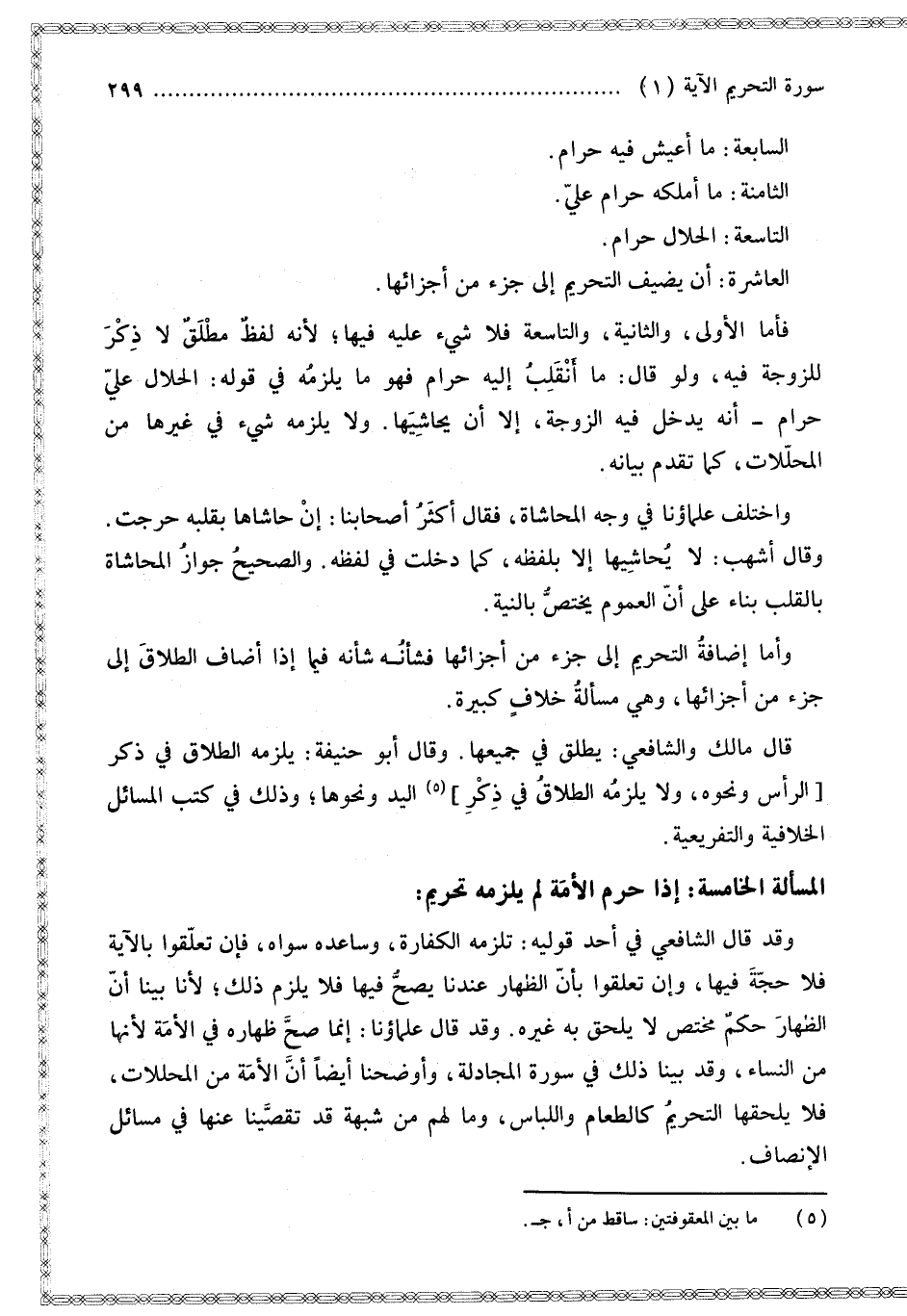 الْمَسْأَلَةُ الْخَامِسَةُ إذَا حَرَّمَ الْأَمَةَ لَمْ يَلْزَمْهُ تَحْرِيمٌ، وَقَدْ قَالَ الشَّافِعِيُّ فِي أَحَدِ قَوْلَيْهِ: تَلْزَمُهُ الْكَفَّارَةُ، وَسَاعَدَهُ سِوَاهُ، فَإِنْ تَعَلَّقُوا بِالْآيَةِ فَلَا حُجَّةَ فِيهَا، وَإِنْ تَعَلَّقُوا بِأَنَّ الظِّهَارَ عِنْدَنَا يَصِحُّ فِيهَا فَلَا يَلْزَمُ ذَلِكَ؛ لِأَنَّا بَيَّنَّا أَنَّ الظِّهَارَ حُكْمٌ مُخْتَصٌّ لَا يَلْحَقُ بِهِ غَيْرُهُ. وَقَدْ قَالَ عُلَمَاؤُنَا: إنَّمَا صَحَّ ظِهَارُهُ فِي الْأَمَةِ لِأَنَّهَا مِنْ النِّسَاءِ، وَقَدْ بَيَّنَّا ذَلِكَ فِي سُورَةِ الْمُجَادَلَةِ، وَأَوْضَحْنَا أَيْضًا أَنَّ الْأَمَةَ مِنْ الْمُحَلَّلَاتِ، فَلَا يَلْحَقُهَا التَّحْرِيمُ كَالطَّعَامِ وَاللِّبَاسِ، وَمَا لَهُمْ مِنْ شُبْهَةٍ قَدْ تَقَصَّيْنَا عَنْهَا فِي مَسَائِلِ الْإِنْصَافِ.