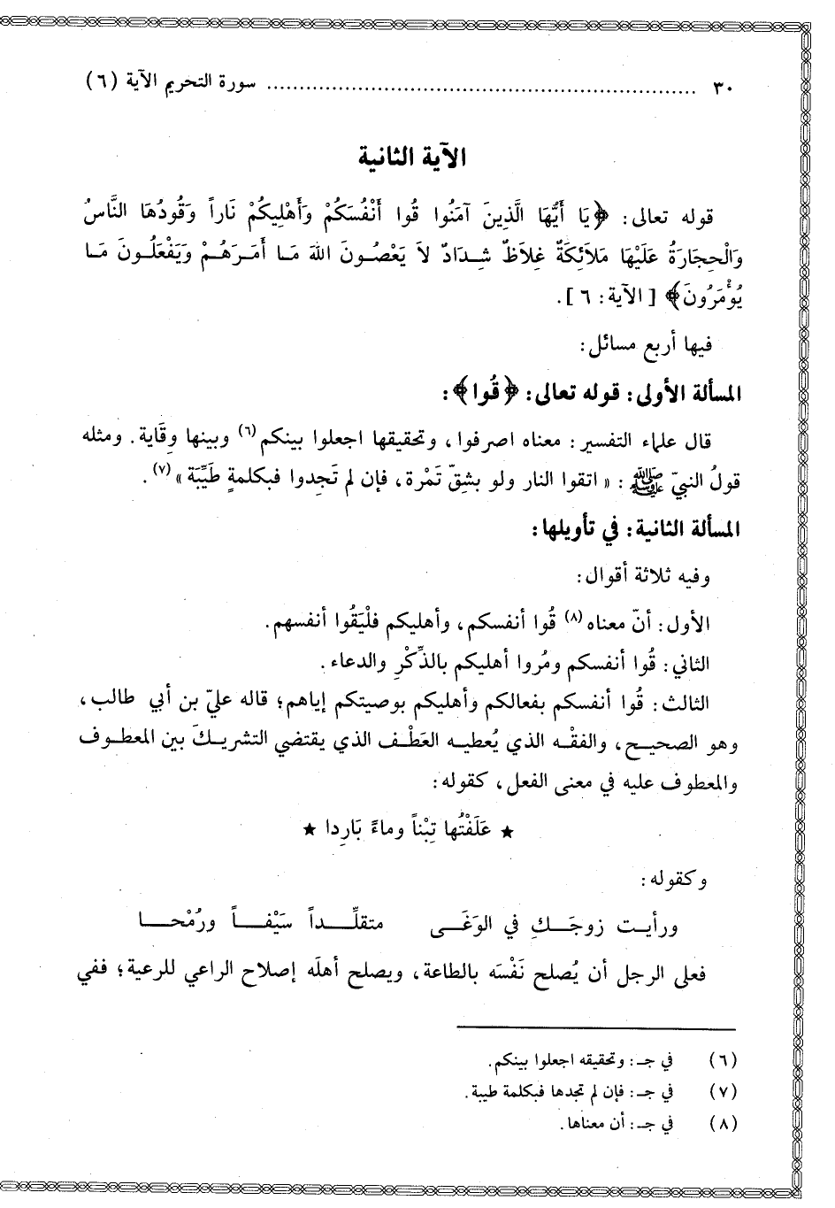 الْمَسْأَلَةُ الْأُولَى قَوْله تَعَالَى: {قُوا} [التحريم: 6]: قَالَ عُلَمَاءُ التَّفْسِيرِ: مَعْنَاهُ اصْرِفُوا، وَتَحْقِيقُهَا اجْعَلُوا بَيْنَكُمْ وَبَيْنَهَا وِقَايَةً. وَمِثْلُهُ قَوْلُ النَّبِيِّ - صَلَّى اللَّهُ عَلَيْهِ وَسَلَّمَ -: «اتَّقُوا النَّارَ وَلَوْ بِشِقِّ تَمْرَةٍ، فَإِنْ لَمْ تَجِدُوا فَبِكَلِمَةٍ طَيِّبَةٍ». الْمَسْأَلَةُ الثَّانِيَةُ: فِي تَأْوِيلِهَا. وَفِيهِ ثَلَاثَةُ أَقْوَالٍ: الْأَوَّلُ: أَنَّ مَعْنَاهُ قُوا أَنْفُسَكُمْ، وَأَهْلِيكُمْ فَلْيَقُوا أَنْفُسَهُمْ.