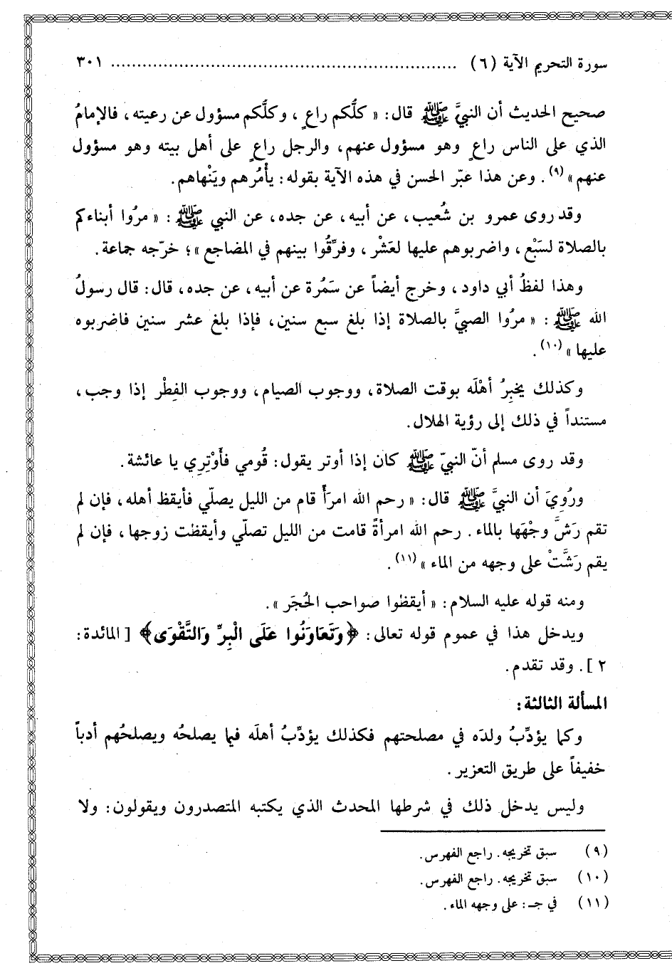 صَحِيحِ الْحَدِيثِ أَنَّ النَّبِيَّ - صَلَّى اللَّهُ عَلَيْهِ وَسَلَّمَ - قَالَ: «كُلُّكُمْ رَاعٍ، وَكُلُّكُمْ مَسْئُولٌ عَنْ رَعِيَّتِهِ، فَالْإِمَامُ الَّذِي عَلَى النَّاسِ رَاعٍ وَهُوَ مَسْئُولٌ عَنْهُمْ، وَالرَّجُلُ رَاعٍ عَلَى أَهْلِ بَيْتِهِ وَهُوَ مَسْئُولٌ عَنْهُمْ». وَعَنْ هَذَا عَبَّرَ الْحَسَنُ فِي هَذِهِ الْآيَةِ بِقَوْلِهِ: يَأْمُرُهُمْ وَيَنْهَاهُمْ.