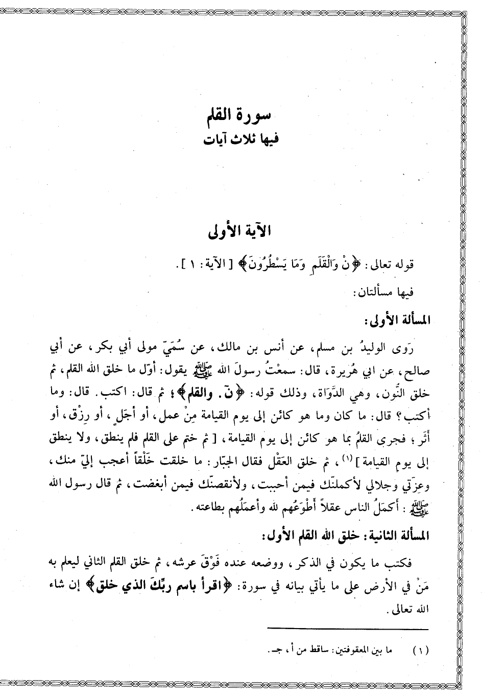 الْآيَةُ الْأُولَى قَوْله تَعَالَى: {ن وَالْقَلَمِ وَمَا يَسْطُرُونَ} [القلم: 1]. فِيهَا مَسْأَلَتَانِ: الْمَسْأَلَةُ الْأُولَى رَوَى الْوَلِيدُ بْنُ مُسْلِمٍ عَنْ أَنَسِ بْنِ مَالِكٍ عَنْ سَمِيٍّ مَوْلَى أَبِي بَكْرٍ عَنْ أَبِي صَالِحٍ، عَنْ أَبِي هُرَيْرَةَ قَالَ: سَمِعْت رَسُولَ اللَّهِ - صَلَّى اللَّهُ عَلَيْهِ وَسَلَّمَ - يَقُولُ: «أَوَّلُ مَا خَلَقَ اللَّهُ الْقَلَمَ، ثُمَّ خَلَقَ النُّونَ، وَهِيَ الدَّوَاةُ، وَذَلِكَ قَوْلُهُ: {ن وَالْقَلَمِ} [القلم: 1]؛ ثُمَّ قَالَ: اُكْتُبْ. قَالَ: وَمَا أَكْتُبُ؟ قَالَ: مَا كَانَ وَمَا هُوَ كَائِنٌ إلَى يَوْمِ الْقِيَامَةِ مِنْ عَمَلٍ، أَوْ أَجَلٍ، أَوْ رِزْقٍ، أَوْ أَثَرٍ؛ فَجَرَى الْقَلَمُ بِمَا هُوَ كَائِنٌ إلَى يَوْمِ الْقِيَامَةِ، ثُمَّ خَتَمَ عَلَى الْقَلَمِ فَلَمْ يَنْطِقْ، وَلَا يَنْطِقُ إلَى يَوْمِ الْقِيَامَةِ، ثُمَّ خَلَقَ الْعَقْلَ فَقَالَ الْجَبَّارُ: مَا خَلَقْت خَلْقًا أَعْجَبَ إلَيَّ مِنْك، وَعِزَّتِي وَجَلَالِي لَأُكَمِّلَنَّكَ فِيمَنْ أَحْبَبْت، وَلَأُنْقِصَنَّكَ فِيمَنْ أَبْغَضْت، ثُمَّ قَالَ رَسُولُ اللَّهِ - صَلَّى اللَّهُ عَلَيْهِ وَسَلَّمَ -: أَكْمَلُ النَّاسِ عَقْلًا أَطْوَعُهُمْ لِلَّهِ وَأَعْمَلُهُمْ بِطَاعَتِهِ» الْمَسْأَلَةُ الثَّانِيَةُ خَلَقَ اللَّهُ الْقَلَمَ الْأَوَّلَ، فَكَتَبَ مَا يَكُونُ فِي الذِّكْرِ، وَوَضَعَهُ عِنْدَهُ فَوْقَ عَرْشِهِ، ثُمَّ خَلَقَ الْقَلَمَ الثَّانِيَ لِيُعَلِّمَ بِهِ مَنْ فِي الْأَرْضِ عَلَى مَا يَأْتِي بَيَانُهُ فِي سُورَةِ: {اقْرَأْ بِاسْمِ رَبِّكَ الَّذِي خَلَقَ} [العلق: 1] إنْ شَاءَ اللَّهُ تَعَالَى.