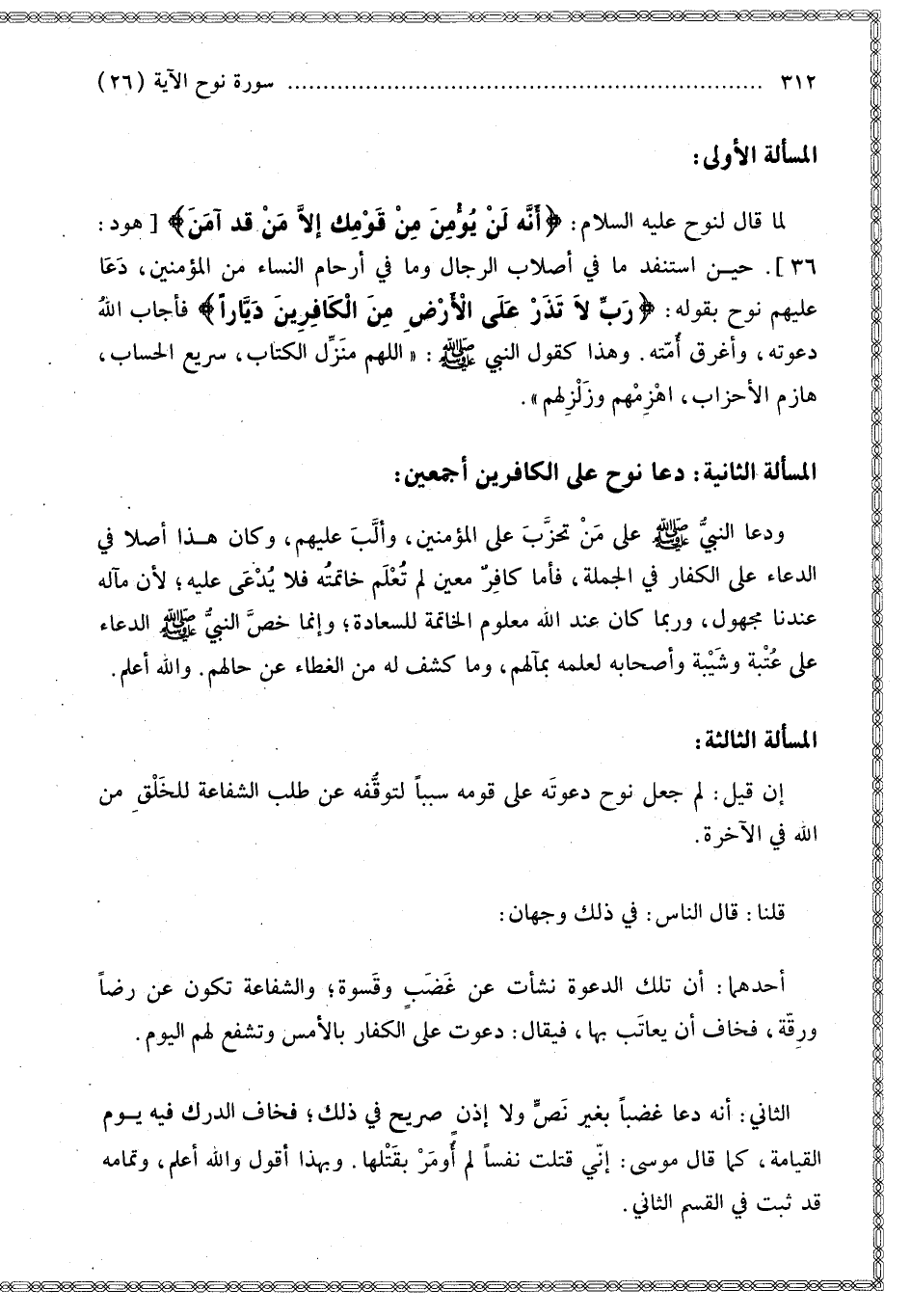 الْمَسْأَلَةُ الْأُولَى لَمَّا قَالَ لِنُوحٍ - عَلَيْهِ السَّلَامُ -: {أَنَّهُ لَنْ يُؤْمِنَ مِنْ قَوْمِكَ إِلا مَنْ قَدْ آمَنَ} [هود: 36] حِينَ اسْتَنْفَدَ مَا فِي أَصْلَابِ الرِّجَالِ وَمَا فِي أَرْحَامِ النِّسَاءِ مِنْ الْمُؤْمِنِينَ، دَعَا عَلَيْهِمْ نُوحٌ بِقَوْلِهِ: {رَبِّ لا تَذَرْ عَلَى الأَرْضِ مِنَ الْكَافِرِينَ دَيَّارًا} [نوح: 26] فَأَجَابَ اللَّهُ دَعْوَتَهُ، وَأَغْرَقَ أُمَّتَهُ. وَهَذَا كَقَوْلِ النَّبِيِّ - صَلَّى اللَّهُ عَلَيْهِ وَسَلَّمَ -: «اللَّهُمَّ مُنْزِلَ الْكِتَابِ، سَرِيعَ الْحِسَابِ، هَازِمَ الْأَحْزَابِ، اهْزِمْهُمْ وَزَلْزِلْهُمْ».