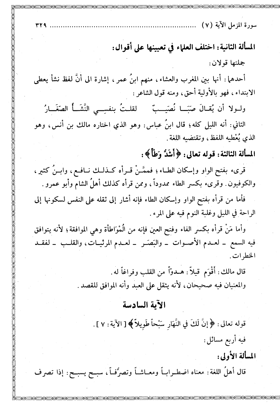 } [المزمل: 7] فِيهِ أَرْبَعُ مَسَائِلَ: