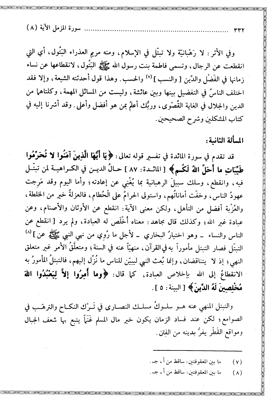 الْمَسْأَلَةُ الثَّانِيَةُ قَدْ تَقَدَّمَ فِي سُورَةِ الْمَائِدَةِ [تَفْسِيرُ] قَوْله تَعَالَى: {يَا أَيُّهَا الَّذِينَ آمَنُوا لا تُحَرِّمُوا طَيِّبَاتِ مَا أَحَلَّ اللَّهُ لَكُمْ} [المائدة: 87] حَالُ الدِّينِ فِي الْكَرَاهِيَةِ لِمَنْ تَبَتَّلَ فِيهِ، وَانْقَطَعَ، وَسَلَكَ سَبِيلَ الرَّهْبَانِيَّةِ بِمَا يُغْنِي عَنْ إعَادَتِهِ، وَأَمَّا الْيَوْمُ وَقَدْ مَرِجَتْ عُهُودُ النَّاسِ، وَخَفَّتْ أَمَانَاتُهُمْ، وَاسْتَوْلَى الْحَرَامُ عَلَى الْحُطَامِ، فَالْعُزْلَةُ خَيْرٌ مِنْ الْخُلْطَةِ، وَالْعُزْبَةُ أَفْضَلُ مِنْ التَّأَهُّلِ، وَلَكِنَّ مَعْنَى الْآيَةِ: انْقَطَعَ عَنْ الْأَوْثَانِ وَالْأَصْنَامِ، وَعَنْ عِبَادَةِ غَيْرِ اللَّهِ؛ وَكَذَلِكَ قَالَ مُجَاهِدٌ: مَعْنَاهُ أَخْلِصْ لَهُ الْعِبَادَةَ، وَلَمْ يُرِدْ [انْقَطِعْ عَنْ النَّاسِ وَالنِّسَاءِ وَهُوَ اخْتِيَارُ الْبُخَارِيِّ لِأَجْلِ مَا رُوِيَ مِنْ «نَهْيِ النَّبِيِّ - صَلَّى اللَّهُ عَلَيْهِ وَسَلَّمَ - عَنْ] التَّبَتُّلِ» فَصَارَ التَّبَتُّلُ مَأْمُورًا بِهِ