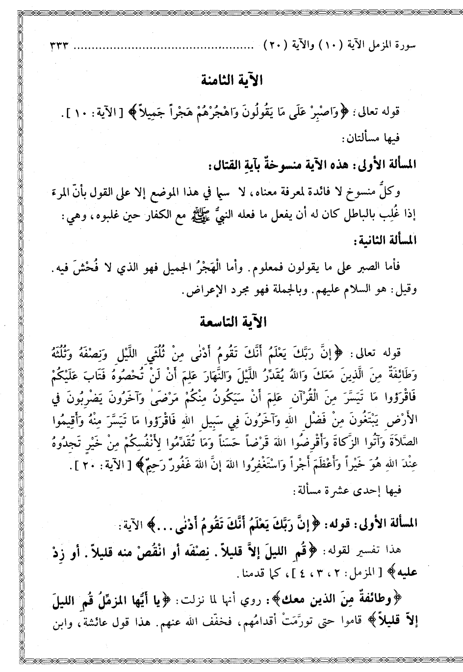 ُ أَدْنَى مِنْ ثُلُثَيِ اللَّيْلِ وَنِصْفَهُ وَثُلُثَهُ وَطَائِفَةٌ مِنَ الَّذِينَ مَعَكَ وَاللَّهُ يُقَدِّرُ اللَّيْلَ وَالنَّهَارَ عَلِمَ أَنْ لَنْ تُحْصُوهُ فَتَابَ عَلَيْكُمْ فَاقْرَءُوا مَا تَيَسَّرَ مِنَ الْقُرْآنِ عَلِمَ أَنْ سَيَكُونُ مِنْكُمْ مَرْضَى وَآخَرُونَ يَضْرِبُونَ فِي الأَرْضِ يَبْتَغُونَ مِنْ فَضْلِ اللَّهِ وَآخَرُونَ يُقَاتِلُونَ فِي سَبِيلِ اللَّهِ فَاقْرَءُوا مَا تَيَسَّرَ مِنْهُ وَأَقِيمُوا الصَّلاةَ وَآتُوا الزَّكَاةَ وَأَقْرِضُوا اللَّهَ قَرْضًا حَسَنًا وَمَا تُقَدِّمُوا لأَنْفُسِكُمْ مِنْ خَيْرٍ تَجِدُوهُ عِنْدَ اللَّهِ هُوَ خَيْرًا وَأَعْظَمَ أَجْرًا وَاسْتَغْفِرُوا اللَّهَ إِنَّ اللَّهَ غَفُورٌ رَحِيمٌ} [المزمل: 20]. فِيهَا إحْدَى عَشْرَةَ مَسْأَلَةً: