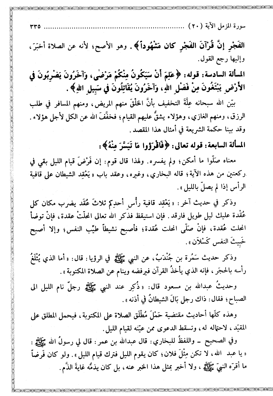 الْمَسْأَلَةُ السَّابِعَةُ قَوْلُهُ: {فَاقْرَءُوا مَا تَيَسَّرَ مِنْهُ} [المزمل: 20]: مَعْنَاهُ صَلُّوا مَا أَمْكَنَ؛ وَلَمْ يُفَسِّرْهُ. وَلِهَذَا قَالَ قَوْمٌ: إنَّ فَرْضَ قِيَامِ اللَّيْلِ بَقِيَ فِي رَكْعَتَيْنِ مِنْ هَذِهِ الْآيَةِ؛ قَالَهُ الْبُخَارِيُّ، وَغَيْرُهُ، وَعَقَدَ بَابَ: «يَعْقِدُ الشَّيْطَانُ عَلَى قَافِيَةِ الرَّأْسِ إذَا لَمْ يُصَلِّ بِاللَّيْلِ» وَذَكَرَ فِي حَدِيثٍ آخَرَ: «يَعْقِدُ قَافِيَةَ رَأْسِ أَحَدِكُمْ ثَلَاثَ عُقَدٍ يَضْرِبُ مَكَانَ كُلِّ عُقْدَةٍ عَلَيْك لَيْلٌ طَوِيلٌ فَارْقُدْ. فَإِنْ اسْتَيْقَظَ فَذَكَرَ اللَّهَ تَعَالَى انْحَلَّتْ عُقْدَةٌ، فَإِنْ تَوَضَّأَ انْحَلَّتْ عُقْدَةٌ، فَإِنْ صَلَّى انْحَلَّتْ عُقْدَةٌ؛ فَأَصْبَحَ نَشِيطًا طَيِّبَ النَّفْسِ؛ وَإِلَّا أَصْبَحَ خَبِيثَ النَّفْسِ كَسْلَانَ».