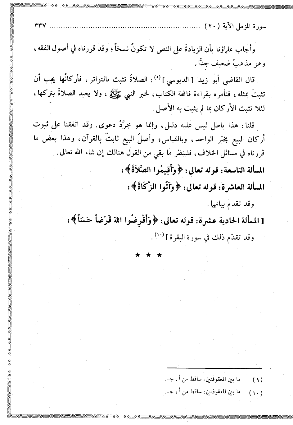 قُلْنَا: هَذَا بَاطِلٌ لَيْسَ عَلَيْهِ دَلِيلٌ، وَإِنَّمَا هُوَ مُجَرَّدُ دَعْوَى. وَقَدْ اتَّفَقْنَا عَلَى ثُبُوتِ أَرْكَانِ الْبَيْعِ بِخَبَرِ الْوَاحِدِ، وَبِالْقِيَاسِ؛ وَأَصْلُ الْبَيْعِ ثَابِتٌ بِالْقُرْآنِ، وَهَذَا بَعْضُ مَا قَرَّرْنَاهُ فِي مَسَائِلِ الْخِلَافِ، فَلْيُنْظَرْ مَا بَقِيَ مِنْ الْقَوْلِ هُنَالِكَ إنْ شَاءَ اللَّهُ تَعَالَى. الْمَسْأَلَةُ التَّاسِعَةُ قَوْلُهُ: {وَأَقِيمُوا الصَّلاةَ} [المزمل: 20].