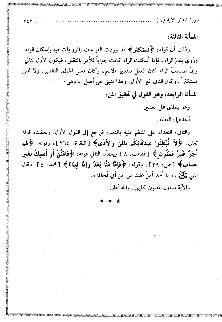 وَالثَّانِي التَّعْدَادُ عَلَى الْمُنْعَمِ عَلَيْهِ بِالنِّعَمِ، فَيَرْجِعُ إلَى الْقَوْلِ الْأَوَّلِ. وَيُعَضِّدُهُ قَوْله تَعَالَى: {لا تُبْطِلُوا صَدَقَاتِكُمْ بِالْمَنِّ وَالأَذَى} [البقرة: 264] وَقَوْلُهُ: {لَهُمْ أَجْرٌ غَيْرُ مَمْنُونٍ} [فصلت: 8] وَيُعَضِّدُ الثَّانِيَ قَوْلُهُ: {فَامْنُنْ أَوْ أَمْسِكْ بِغَيْرِ حِسَابٍ} [ص: 39] وَقَوْلُهُ: {فَإِمَّا مَنًّا بَعْدُ وَإِمَّا فِدَاءً} [محمد: 4].