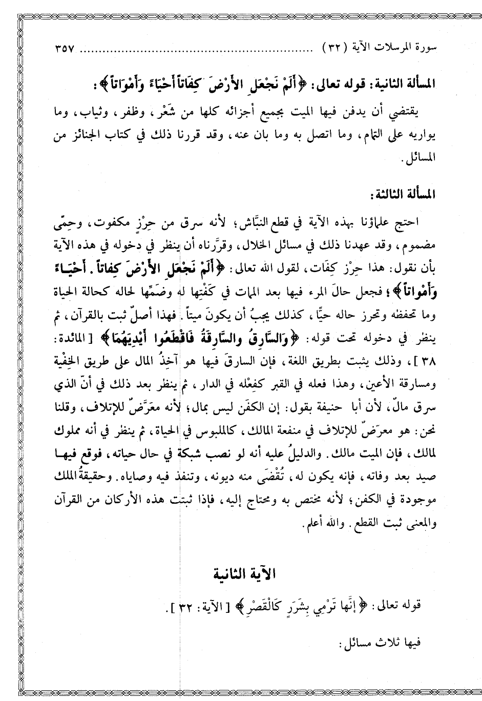 الْمَسْأَلَةُ الثَّالِثَةُ احْتَجَّ عُلَمَاؤُنَا بِهَذِهِ الْآيَةِ فِي قَطْعِ النَّبَّاشِ لِأَنَّهُ سَرَقَ مِنْ حِرْزٍ مَكْفُوتٍ، وَحِمًى مَضْمُومٍ، وَقَدْ مَهَّدْنَا ذَلِكَ فِي مَسَائِلِ الْخِلَافِ، وَقَرَّرْنَا أَنْ يُنْظَرَ فِي دُخُولِهِ فِي هَذِهِ الْآيَةِ بِأَنْ نَقُولَ: هَذَا حِرْزٌ كِفَاتٌ، لِقَوْلِ اللَّهِ تَعَالَى: {أَلَمْ نَجْعَلِ الأَرْضَ كِفَاتًا} [المرسلات: 25] {أَحْيَاءً وَأَمْوَاتًا} [المرسلات: 26] فَجَعَلَ حَالَ الْمَرْءِ فِيهَا بَعْدَ الْمَمَاتِ فِي كَفْتِهَا لَهُ وَضَمِّهَا لِحَالِهِ كَحَالَةِ الْحَيَاةِ وَمَا تَحْفَظُهُ وَتَحْرُزُ حَيًّا، كَذَلِكَ يَجِبُ أَنْ يَكُونَ مَيِّتًا فَهَذَا أَصْلٌ ثَبَتَ بِالْقُرْآنِ، ثُمَّ يُنْظَرُ فِي دُخُولِهِ تَحْتَ قَوْلِهِ: {وَالسَّارِقُ وَالسَّارِقَةُ فَاقْطَعُوا أَيْدِيَهُمَا} [المائدة: 38] وَذَلِكَ يَثْبُتُ بِطَرِيقِ اللُّغَةِ، فَإِنَّ السَّارِقَ فِيهَا هُوَ آخِذُ الْمَالِ عَلَى طَرِيقِ الْخِفْيَةِ وَمُسَارَقَةِ الْأَعْيُنِ، وَهَذَا فِعْلُهُ فِي الْقَبْرِ كَفِعْلِهِ فِي الدَّارِ، ثُمَّ يُنْظَرُ بَعْدَ ذَلِكَ فِي أَنَّ الَّذِي سُرِقَ مَالٌ؛ لِأَنَّ أَبَا حَنِيفَةَ يَقُولُ: إنَّ الْكَفَنَ لَيْسَ بِمَالٍ؛ لِأَنَّهُ مُعَرَّضٌ لِلْإِتْلَافِ، وَقُلْنَا نَحْنُ: هُوَ مُعَرَّضٌ لِلْإِتْلَافِ فِي مَنْفَعَةِ الْمَالِكِ، كَالْمَلْبُوسِ فِي الْحَيَاةِ، ثُمَّ يُنْظَرُ فِي أَنَّهُ مَمْلُوكٌ لِمَالِكٍ، فَإِنَّ الْمَيِّتَ مَالِكٌ.