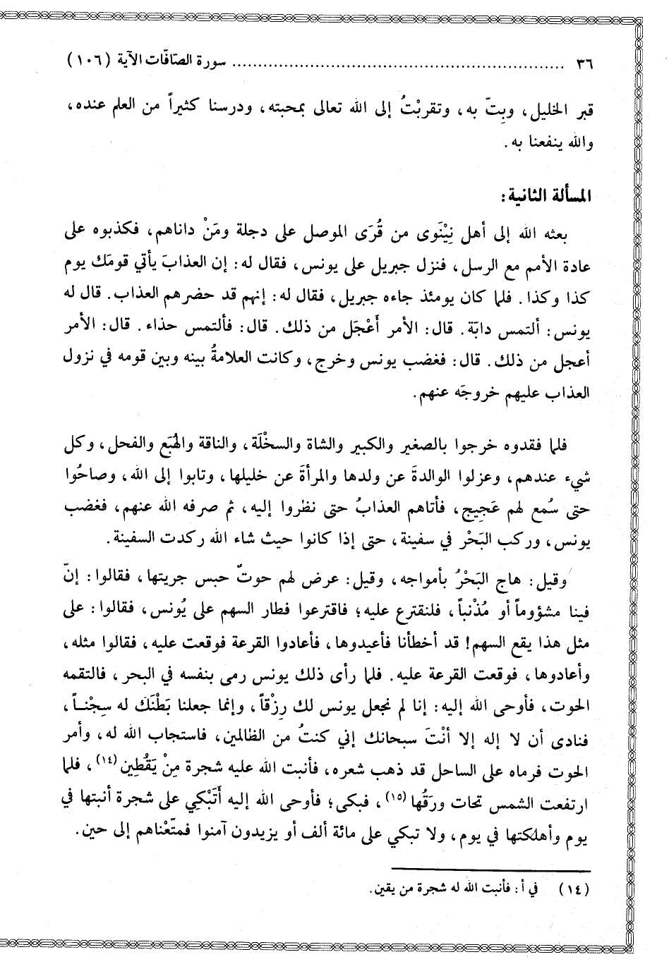 الْمَسْأَلَةُ الثَّانِيَةُ بَعَثَهُ اللَّهُ إلَى أَهْلِ نِينَوَى مِنْ قُرَى الْمَوْصِلِ عَلَى دِجْلَةَ وَمَنْ دَانَاهُمْ، فَكَذَّبُوهُ عَلَى عَادَةِ الْأُمَمِ مَعَ الرُّسُلِ، فَنَزَلَ جِبْرِيلُ عَلَى يُونُسَ، فَقَالَ لَهُ: إنَّ الْعَذَابَ يَأْتِي قَوْمَك يَوْمَ كَذَا وَكَذَا. فَلَمَّا كَانَ يَوْمَئِذٍ جَاءَهُ جِبْرِيلُ، فَقَالَ لَهُ: إنَّهُمْ قَدْ حَضَرَهُمْ الْعَذَابُ.