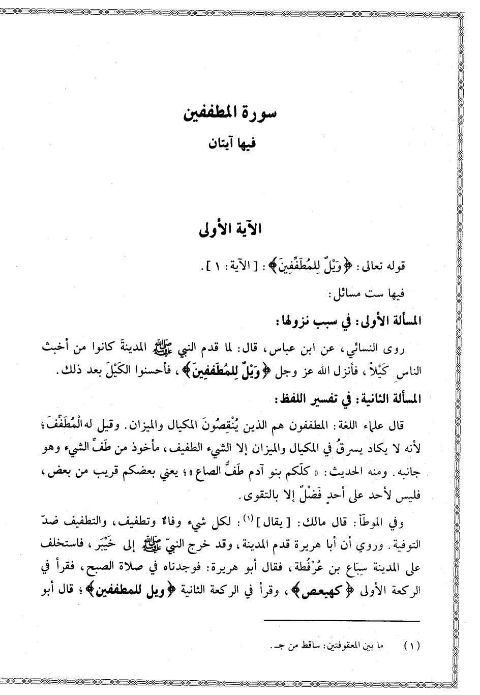 الْمَسْأَلَةُ الْأُولَى فِي سَبَبِ نُزُولِهَا: رَوَى النَّسَائِيّ عَنْ ابْنِ عَبَّاسٍ قَالَ «لَمَّا قَدِمَ النَّبِيُّ - صَلَّى اللَّهُ عَلَيْهِ وَسَلَّمَ - الْمَدِينَةَ كَانُوا مِنْ أَخْبَثِ النَّاسِ كَيْلًا، فَأَنْزَلَ اللَّهُ عَزَّ وَجَلَّ {وَيْلٌ لِلْمُطَفِّفِينَ} [المطففين: 1] فَأَحْسَنُوا الْكَيْلَ بَعْدَ ذَلِكَ.» الْمَسْأَلَةُ الثَّانِيَةُ فِي تَفْسِيرِ اللَّفْظِ: قَالَ عُلَمَاءُ اللُّغَةِ: الْمُطَفِّفُونَ هُمْ الَّذِينَ يَنْقُصُونَ الْمِكْيَالَ وَالْمِيزَانَ. وَقِيلَ لَهُ الْمُطَفِّفُ؛ لِأَنَّهُ لَا يَكَادُ يَسْرِقُ فِي الْمِكْيَالِ وَالْمِيزَانِ إلَّا الشَّيْءَ الطَّفِيفَ، مَأْخُوذٌ مِنْ طَفِّ الشَّيْءِ وَهُوَ جَانِبُهُ.