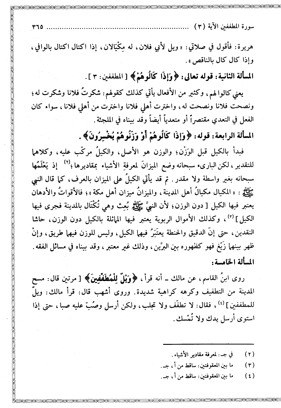 الْمَسْأَلَةُ الرَّابِعَةُ قَوْلُهُ: {وَإِذَا كَالُوهُمْ أَوْ وَزَنُوهُمْ يُخْسِرُونَ} [المطففين: 3]؛ فَبَدَأَ بِالْكَيْلِ قَبْلَ الْوَزْنِ؛ وَالْوَزْنُ هُوَ الْأَصْلُ، وَالْكَيْلُ مُرَكَّبٌ عَلَيْهِ، وَكِلَاهُمَا لِلتَّقْدِيرِ، لَكِنَّ الْبَارِئَ سُبْحَانَهُ وَضَعَ الْمِيزَانَ لِمَعْرِفَةِ الْأَشْيَاءِ بِمَقَادِيرِهَا؛ إذْ يَعْلَمُهَا سُبْحَانَهُ بِغَيْرِ وَاسِطَةٍ وَلَا مُقَدِّرٍ. ثُمَّ قَدْ يَأْتِي الْكَيْلُ عَلَى الْمِيزَانِ بِالْعُرْفِ، كَمَا قَالَ النَّبِيُّ - صَلَّى اللَّهُ عَلَيْهِ وَسَلَّمَ -: «الْمِكْيَالُ مِكْيَالُ أَهْلِ الْمَدِينَةِ، وَالْمِيزَانُ مِيزَانُ أَهْلِ مَكَّةَ» فَالْأَقْوَاتُ وَالْأَدْهَانُ يُعْتَبَرُ فِيهَا الْكَيْلُ [دُونَ الْوَزْنِ، لِأَنَّ النَّبِيَّ - صَلَّى اللَّهُ عَلَيْهِ وَسَلَّمَ - بُعِثَ وَهِيَ تُكْتَالُ بِالْمَدِينَةِ فَجَرَى فِيهَا الْكَيْلُ]، وَكَذَلِكَ الْأَمْوَالُ الرِّبَوِيَّةُ يُعْتَبَرُ فِيهَا الْمُمَاثَلَةُ بِالْكَيْلِ دُونَ الْوَزْنِ، حَاشَا النَّقْدَيْنِ، حَتَّى أَنَّ الدَّقِيقَ وَالْحِنْطَةَ يُعْتَبَرُ فِيهِمَا الْكَيْلُ، وَلَيْسَ لِلْوَزْنِ فِيهِمَا طَرِيقٌ، وَإِنْ ظَهَرَ بَيْنَهُمَا زَيْغٌ فَهُوَ كَظُهُورِهِ بَيْنَ الْبُرَّيْنِ، وَذَلِكَ غَيْرُ مُعْتَبَرٍ، وَقَدْ بَيَّنَّاهُ فِي مَسَائِلِ الْفِقْهِ.