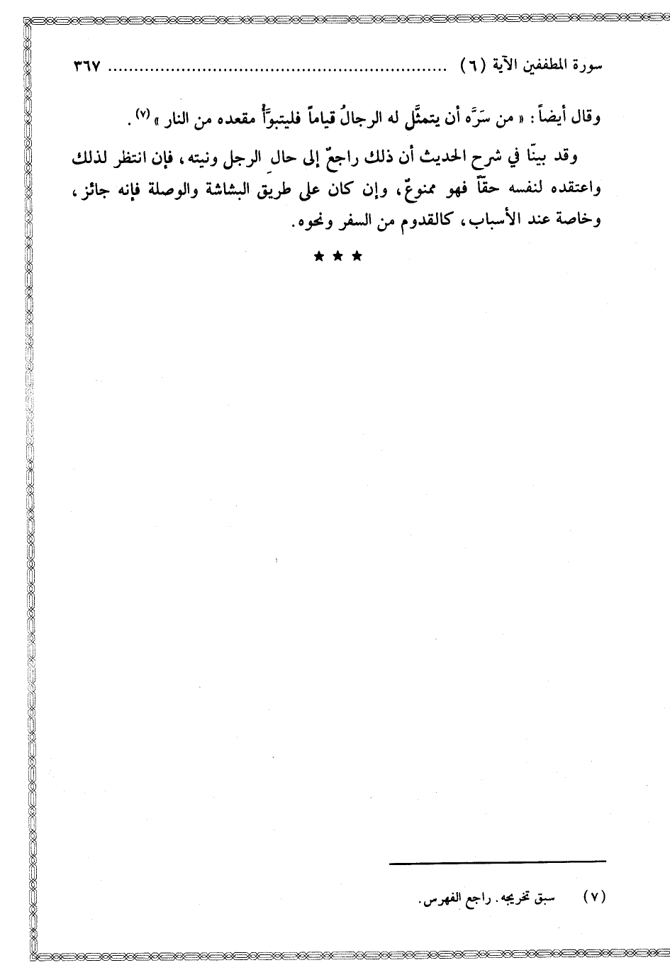 وَقَالَ أَيْضًا: «مَنْ سَرَّهُ أَنْ يَتَمَثَّلَ لَهُ الرِّجَالُ قِيَامًا فَلْيَتَبَوَّأْ مَقْعَدُهُ مِنْ النَّارِ».